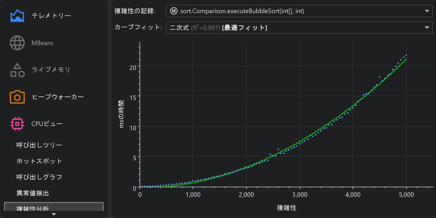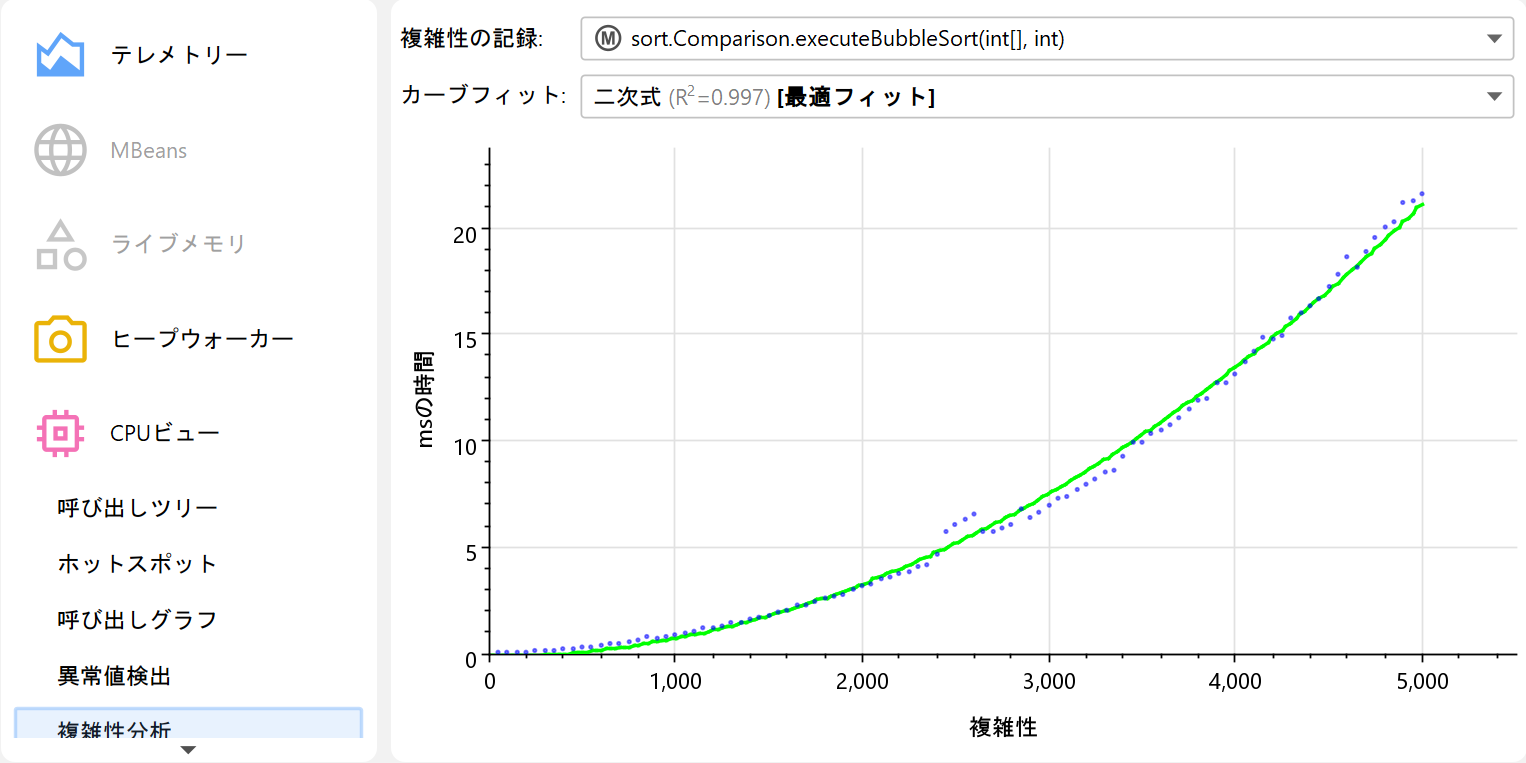 独自の記録を持つ別の特殊なビューは「複雑性分析」です。これは選択されたメソッドの実行時間のみを測定し、CPU記録を有効にする必要はありません。追加のデータ軸は、スクリプトで計算できるメソッドコールのアルゴリズム的複雑性の数値値です。このようにして、メソッドの実行時間がそのパラメータにどのように依存するかを測定できます。