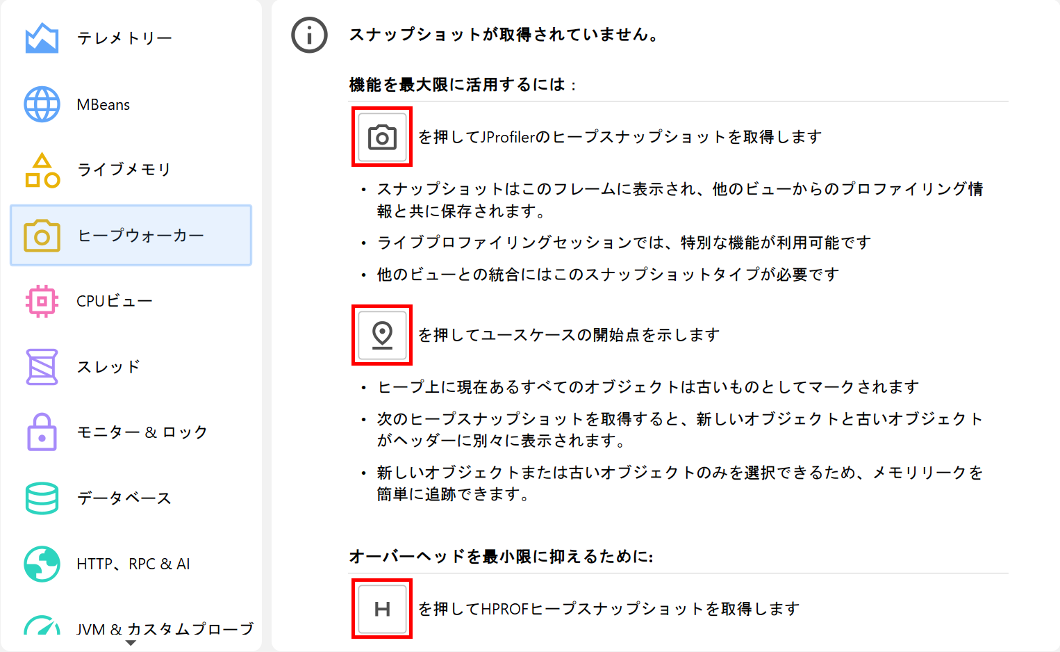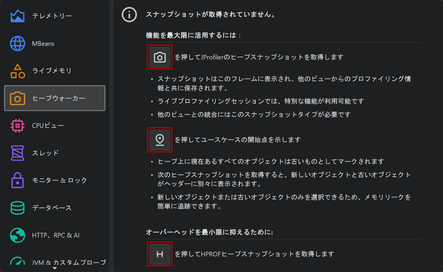 JVMには、古いHPROFプロファイリングエージェントにちなんで名付けられたファイルにヒープ全体をダンプするための特別なトリガーがあります。これはプロファイリングインターフェースとは関係がなく、その制約下で動作しません。このため、HPROFヒープダンプはより高速で、リソースを少なく使用します。欠点は、ヒープウォーカーでヒープスナップショットを表示するときにJVMとのライブ接続がないことと、一部の機能が利用できないことです。