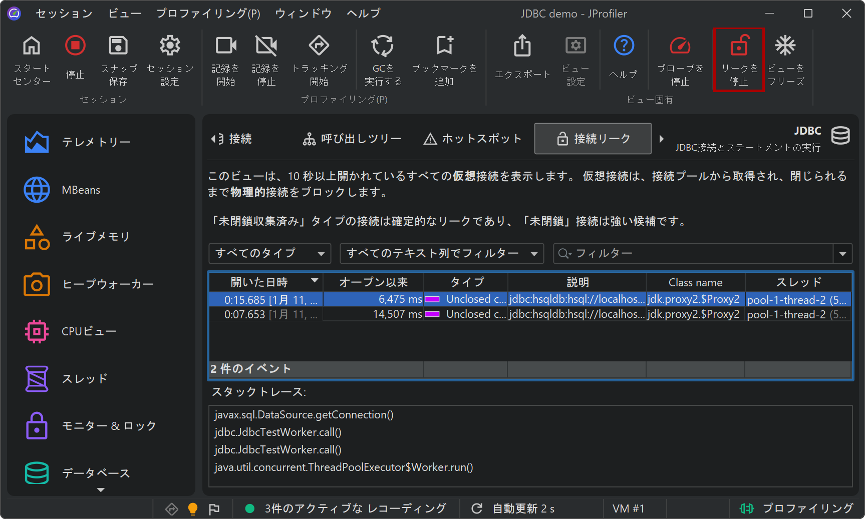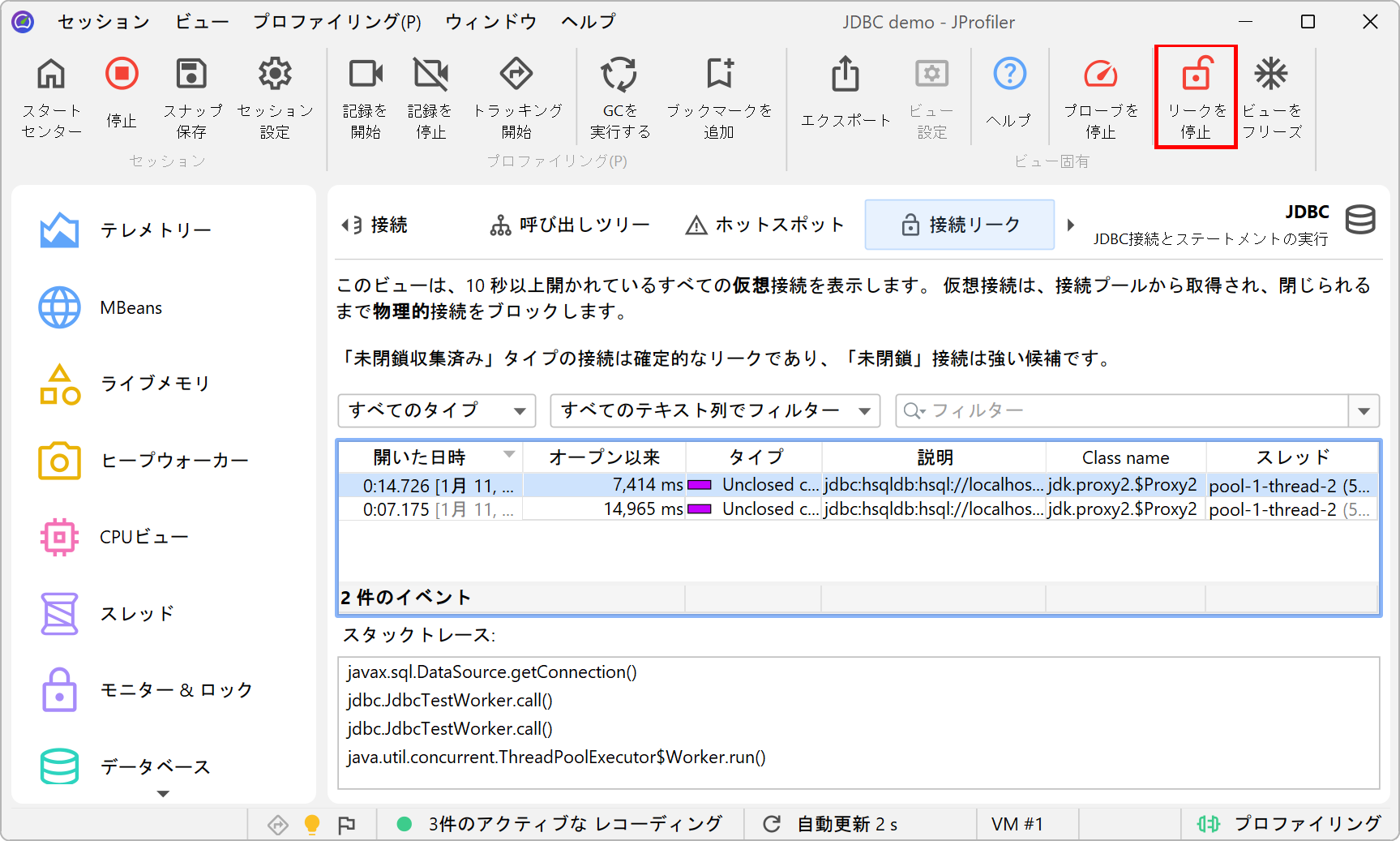 JDBCプローブには、JDBC接続リークを記録するための3番目の記録アクションがあります。接続リークを調査しようとしている場合にのみ、接続リークを探すことに関連するオーバーヘッドが発生します。イベント記録アクションと同様に、リーク記録アクションの選択状態は永続的です。