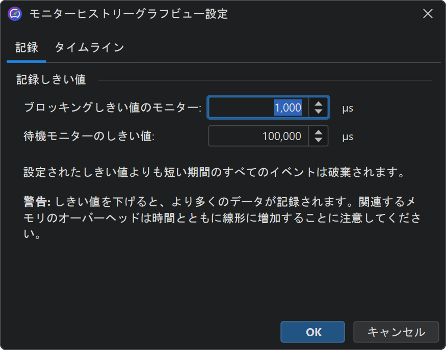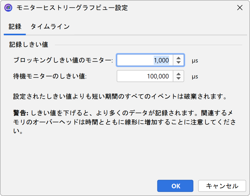 スレッドが待機またはブロックしている理由を分析するには、対応するイベントを記録する必要があります。そのようなイベントの発生率は大きく異なります。スレッドが頻繁にタスクを調整したり、共通のリソースを共有したりするマルチスレッドプログラムでは、そのようなイベントの数が膨大になる可能性があります。このため、そのような時系列データはデフォルトでは記録されません。