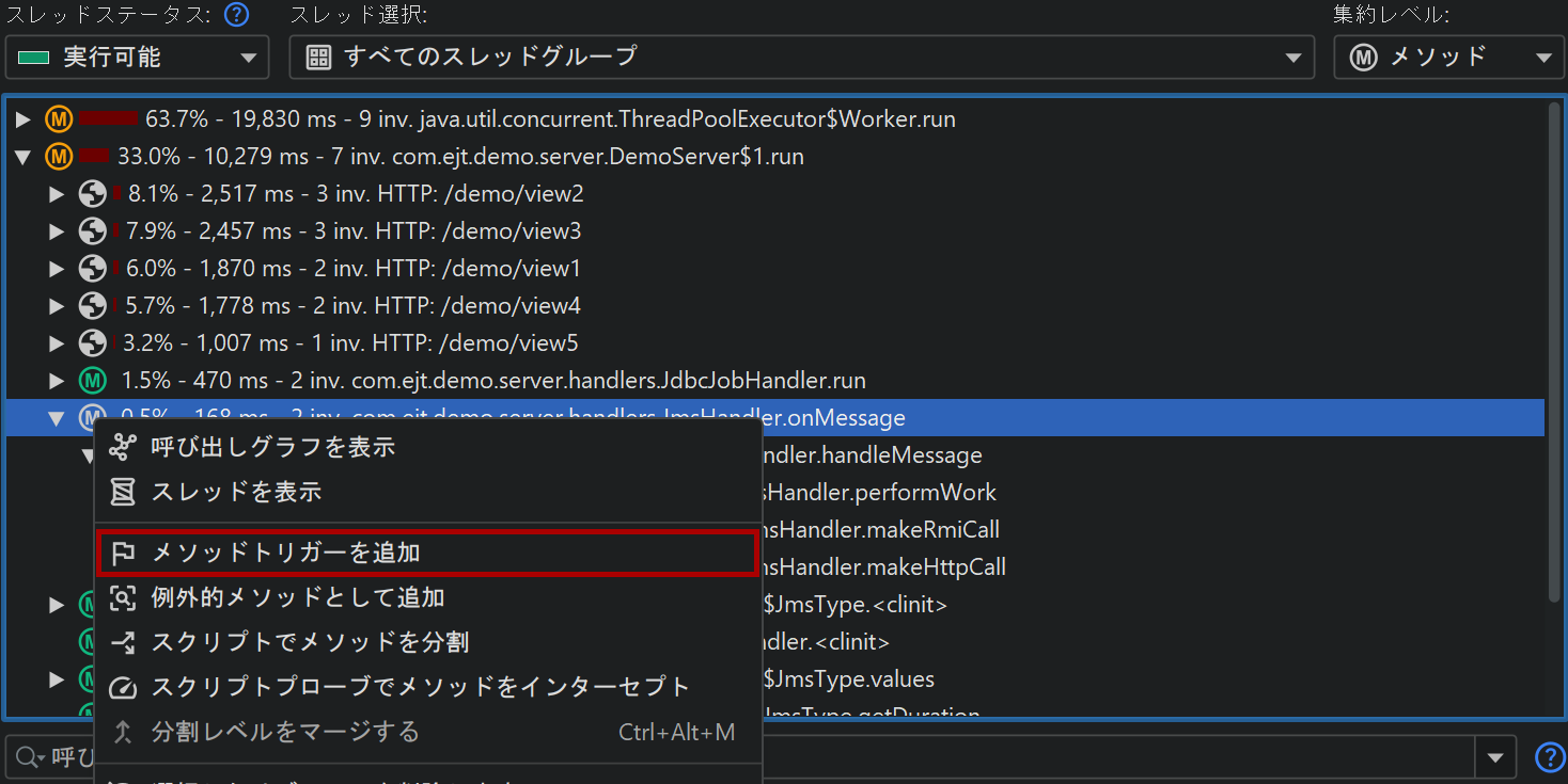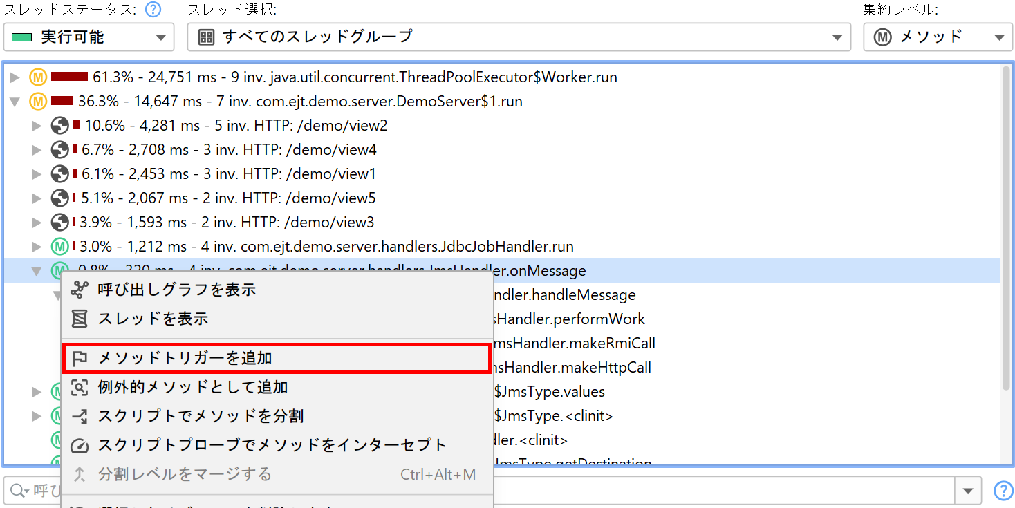 メソッドトリガーは、コンテキストメニューの「メソッドトリガーを追加」アクションを使用して、呼び出しツリーで便利に追加できます。同じセッションにすでにメソッドトリガーがある場合は、既存のトリガーにメソッドインターセプションを追加することを選択できます。
