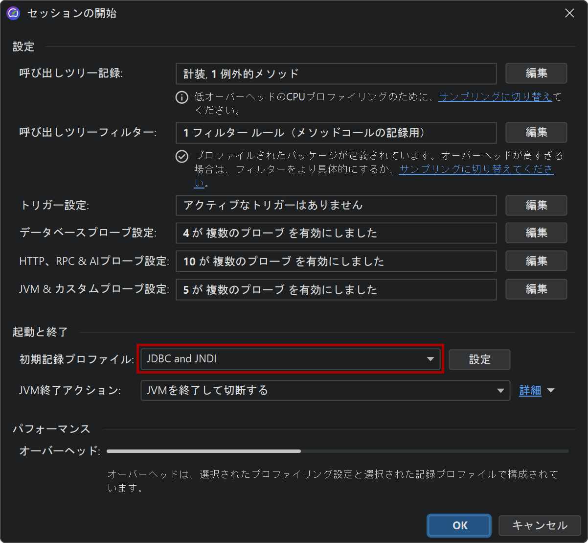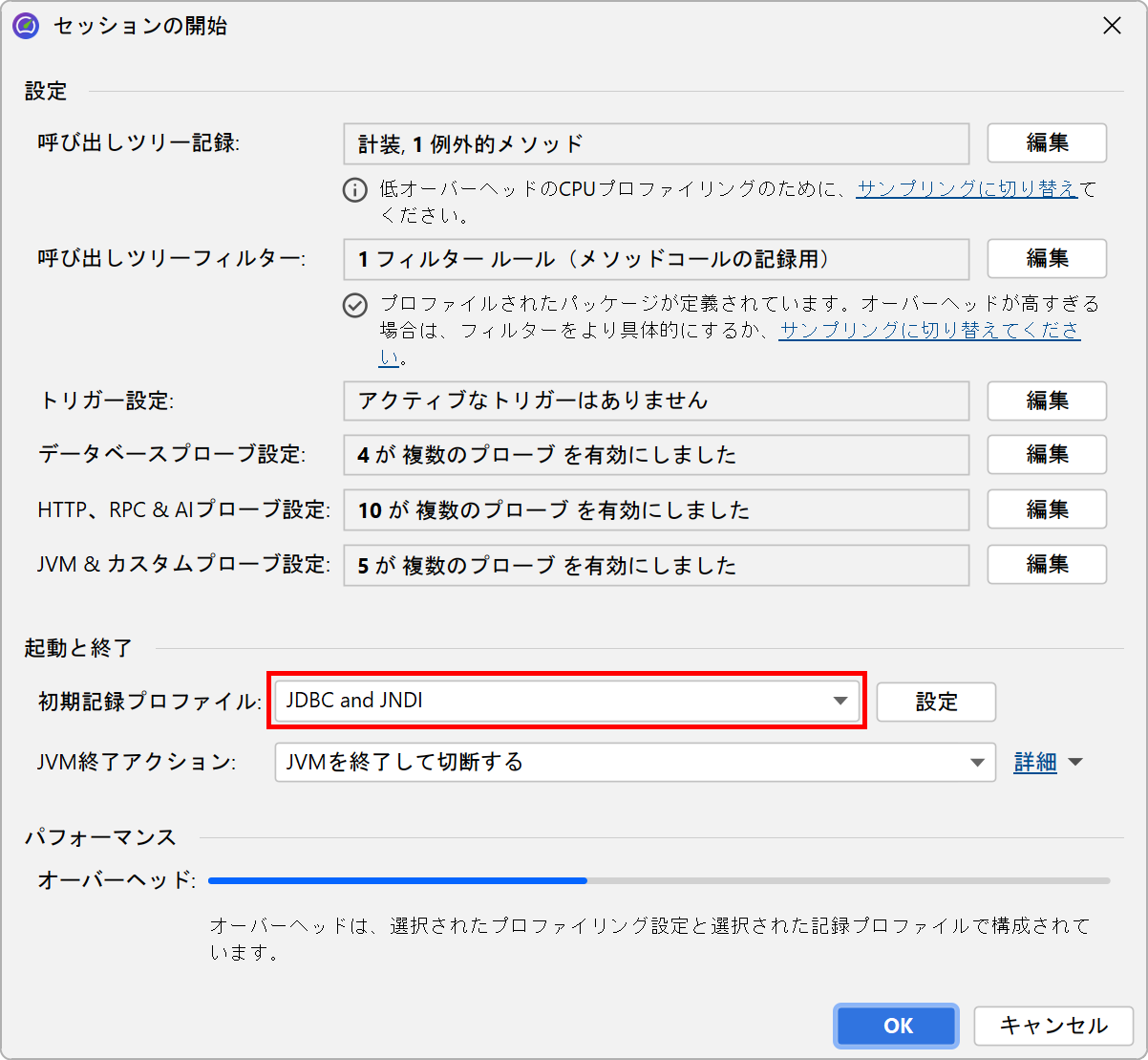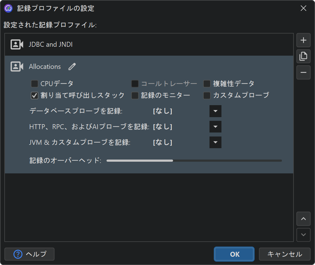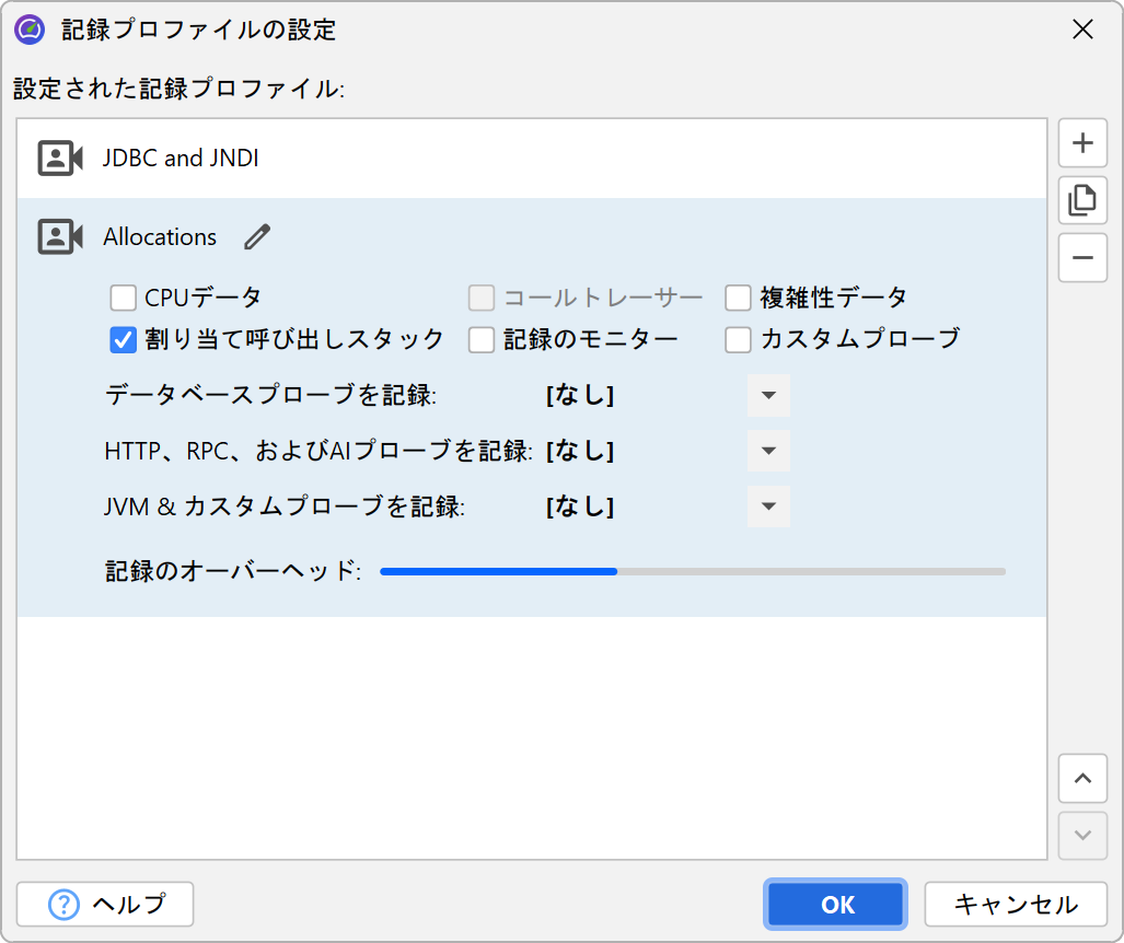 記録プロファイルは、原子的にアクティブ化できる特定の記録の組み合わせを定義します。JProfilerは、選択した記録によって引き起こされるオーバーヘッドについて大まかな印象を与えようとし、問題のある組み合わせを避けるようにします。特に、割り当て記録とCPU記録は一緒にうまく機能しません。なぜなら、割り当て記録がCPUデータのタイミングを大幅に歪めるからです。