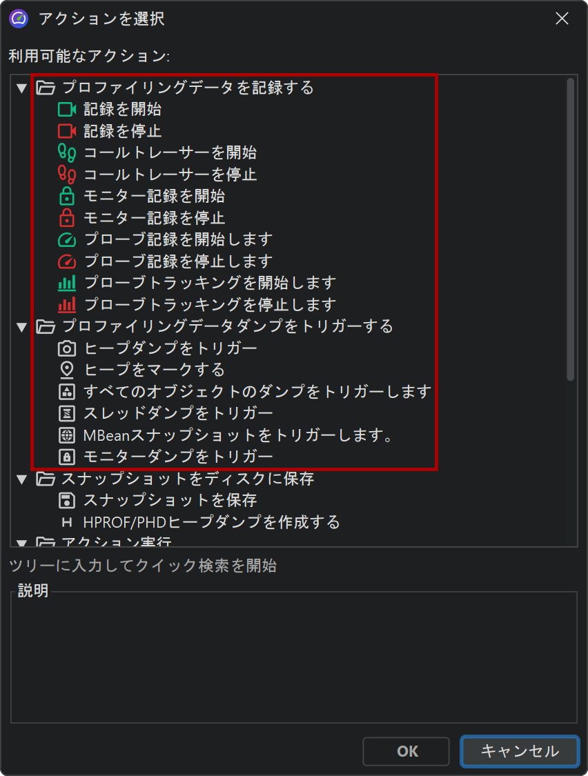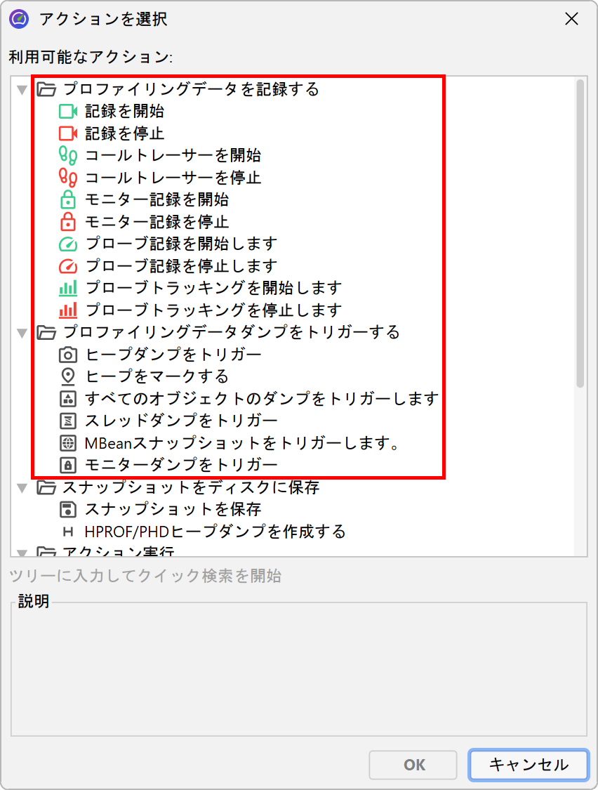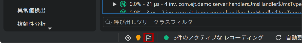記録を開始するもう一つの方法は、APIを通じて行うことです。プロファイルされたVMでは、com.jprofiler.api.controller.Controllerクラスを呼び出して、プログラムで記録を開始および停止できます。詳細とコントローラークラスを含むアーティファクトの取得方法については、オフラインプロファイリングに関する章を参照してください。