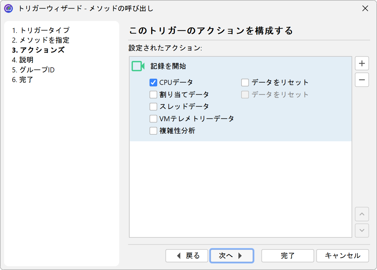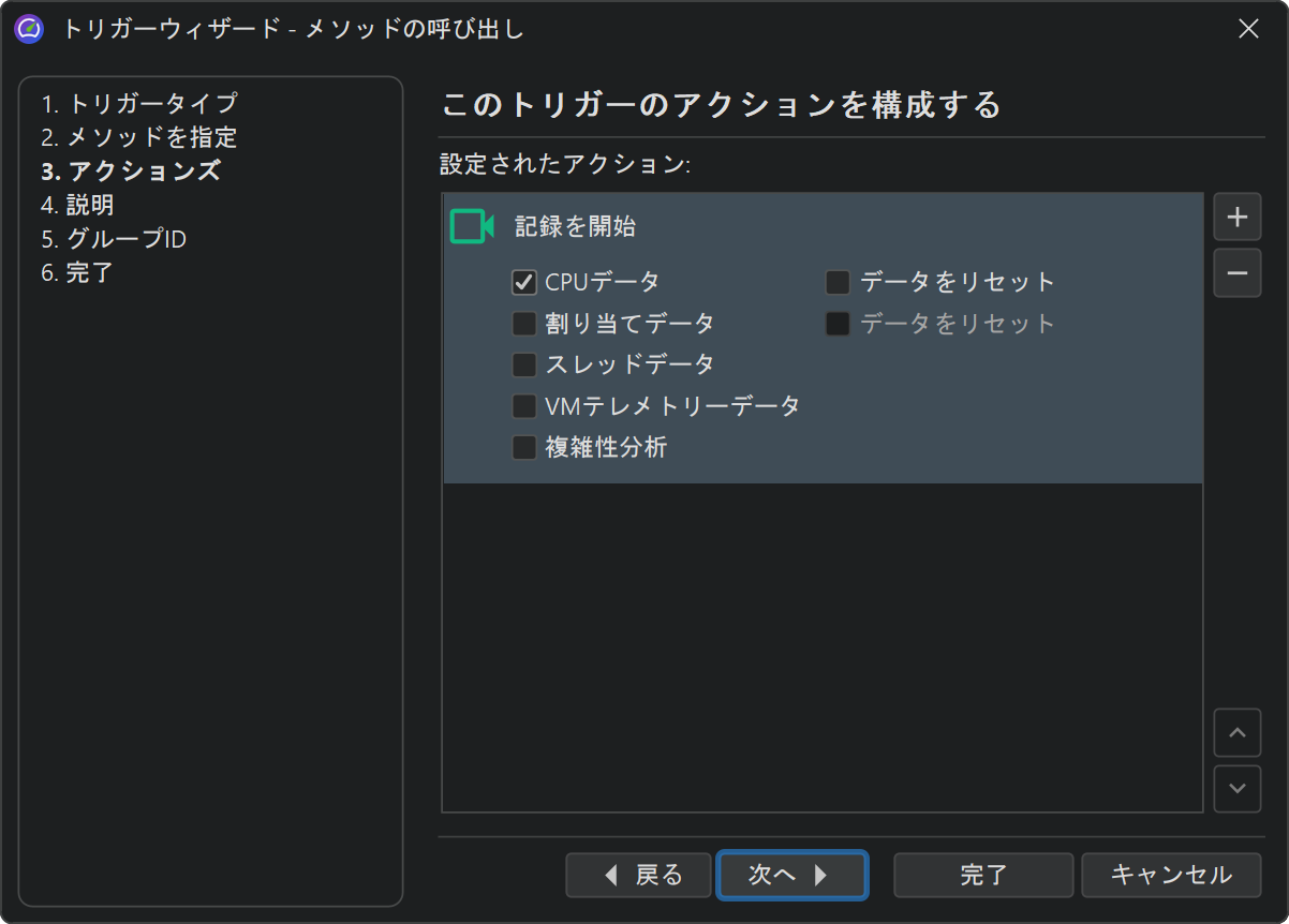 たとえば、特定のメソッドが実行されたときにのみ記録を開始したい場合があります。その場合、セッション設定ダイアログに移動し、トリガー設定タブをアクティブにして、そのメソッドのメソッドトリガーを定義します。アクション設定では、さまざまな記録アクションを選択できます。