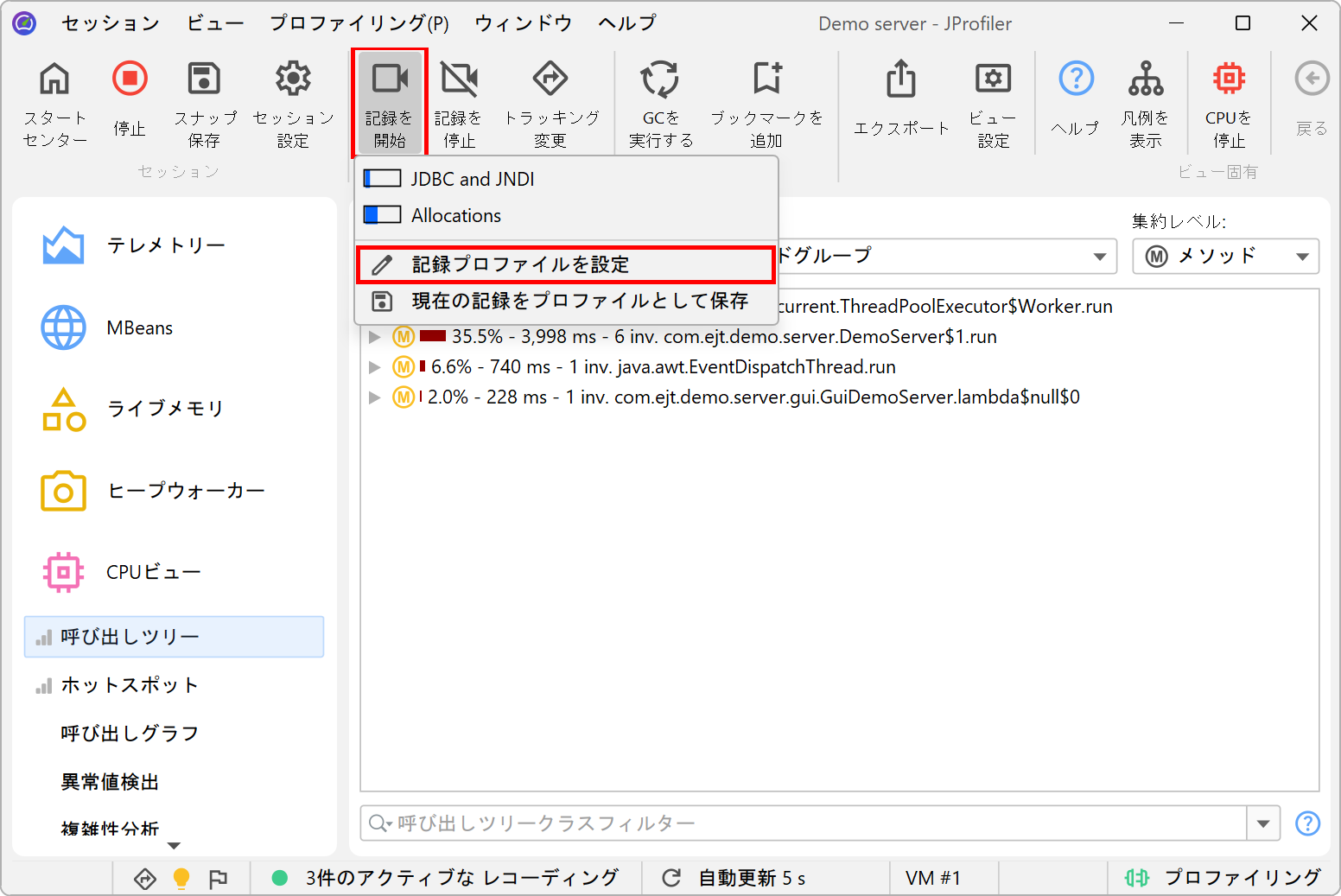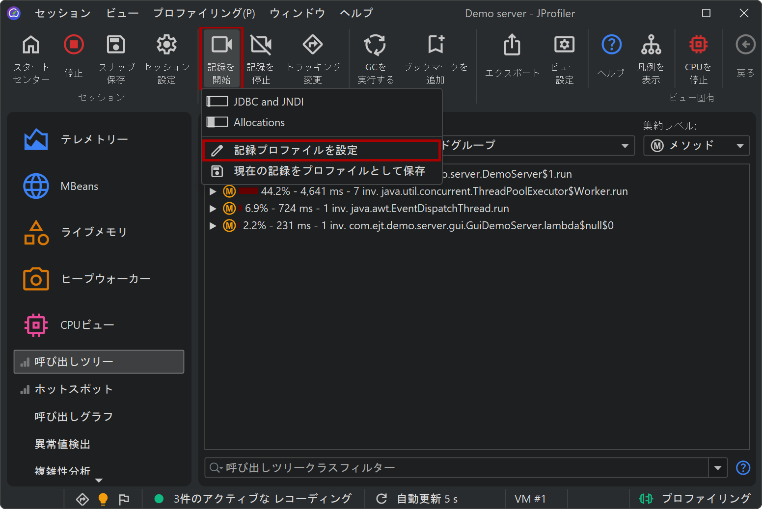 多くの状況で、単一のクリックでさまざまな記録を開始または停止したいことがあります。対応するビューをすべて訪れて、記録ボタンを一つずつ切り替えるのは非現実的です。これが、JProfilerに記録プロファイルがある理由です。記録プロファイルは、ツールバーの記録開始ボタンをクリックして作成できます。