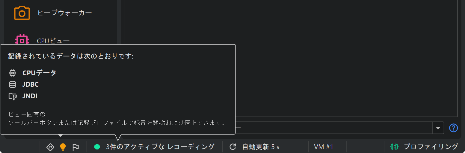 セッションが実行中のときにいつでも記録プロファイルをアクティブ化できます。記録プロファイルは加算的ではなく、記録プロファイルに含まれていないすべての記録を停止します。記録停止ボタンを使用すると、どのようにアクティブ化されたかに関係なく、すべての記録を停止します。現在アクティブな記録を確認するには、ステータスバーの記録ラベルにマウスをホバーします。