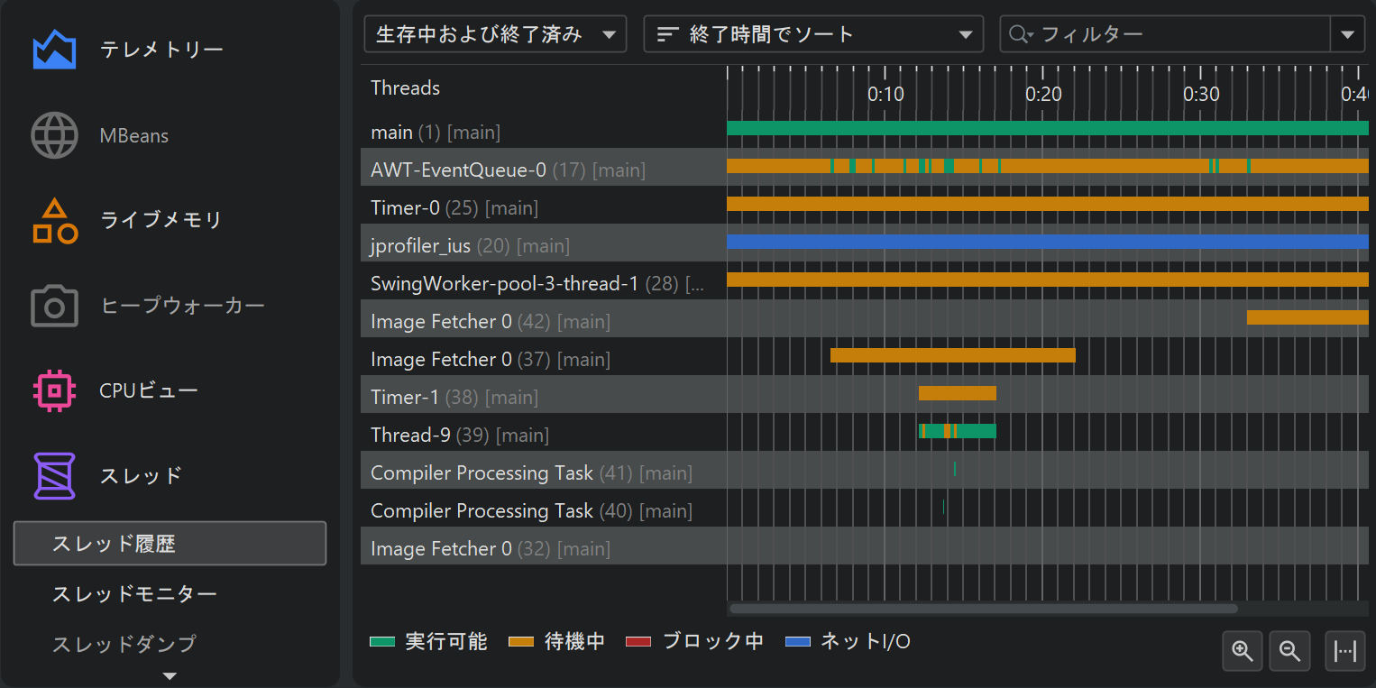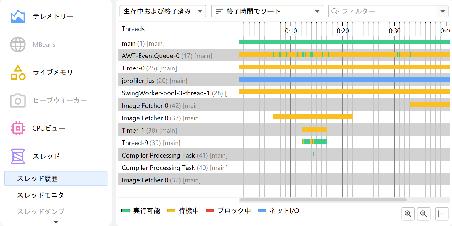 一部の測定は、スレッドが現在いる実行ステータスのような列挙型の値をキャプチャします。この種の測定は、カラー化されたタイムラインとして表示でき、数値テレメトリーよりもはるかに少ないメモリを消費します。スレッドステータスの場合、「スレッド履歴」ビューはJVM内のすべてのスレッドのタイムラインを表示します。数値値を持つテレメトリーと同様に、古い値は統合され、メモリ消費を減らすためにより粗い粒度にされます。