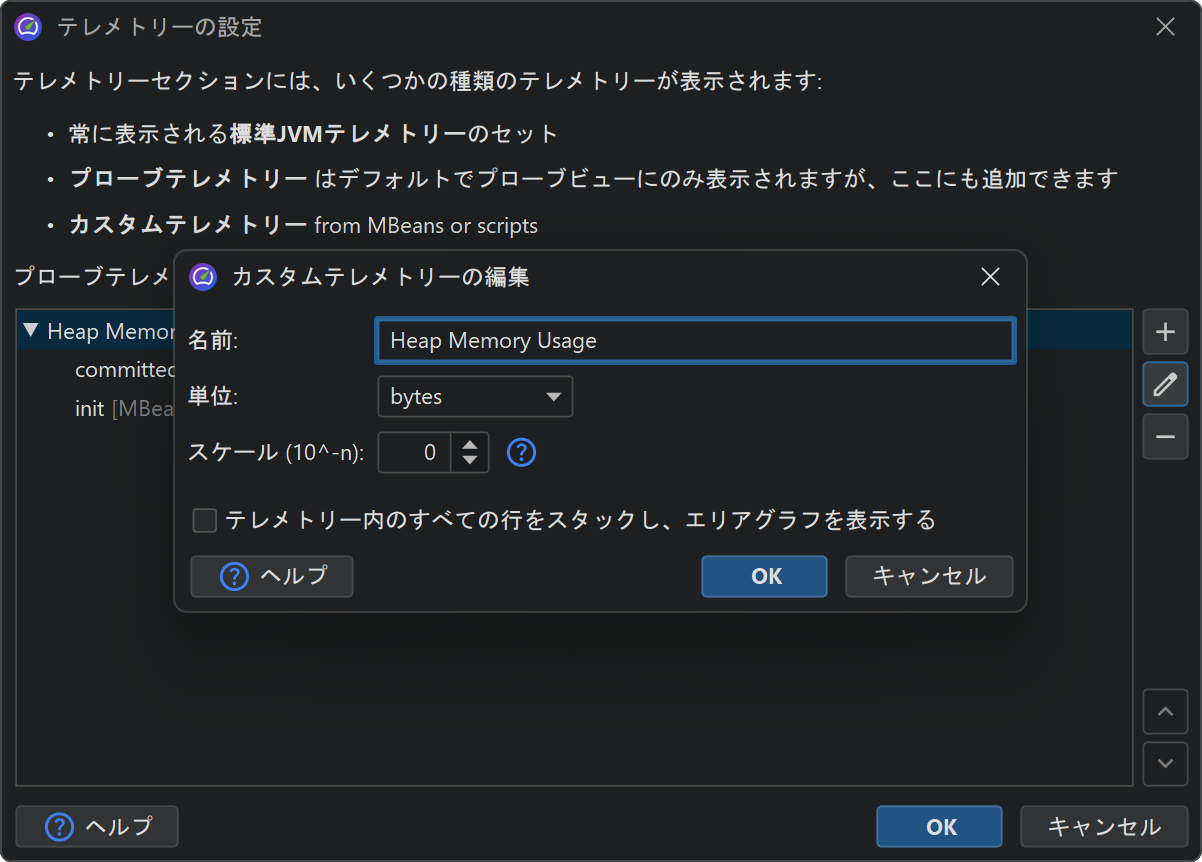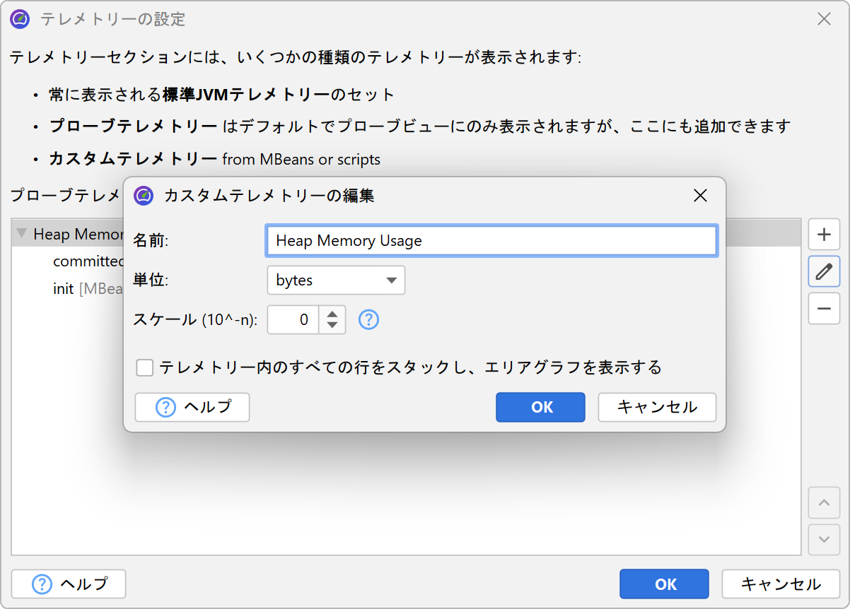 積み上げテレメトリーでは、各テレメトリーラインが加算され、エリアグラフとして表示できます。 スケールファクターは、値をサポートされている単位に変換するのに便利です。 例えば、データソースが kB を返す場合、JProfiler には「kB」単位がないため、 スケールファクターを -3 に設定すると値がバイトに変換され、 テレメトリーの単位として「バイト」を選択すれば、JProfiler が自動的に適切な集約単位で表示します。