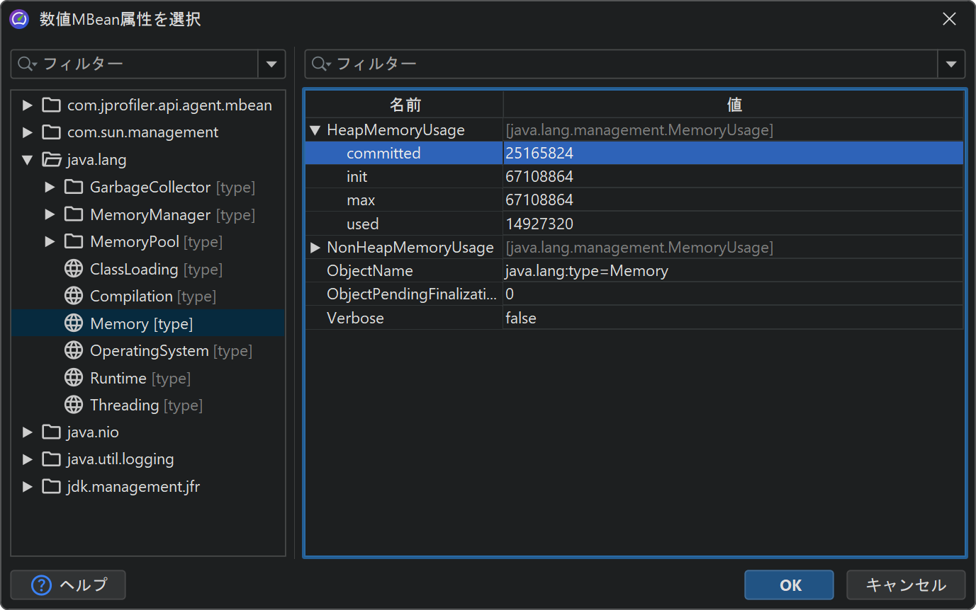上記の例は、プラットフォーム MBean への呼び出しを示しています。MBean のスカラー値をグラフ化するには、 MBean テレメトリーを使うのが便利です。MBean ブラウザで適切な属性を選択できます。 属性値は数値型である必要があります。