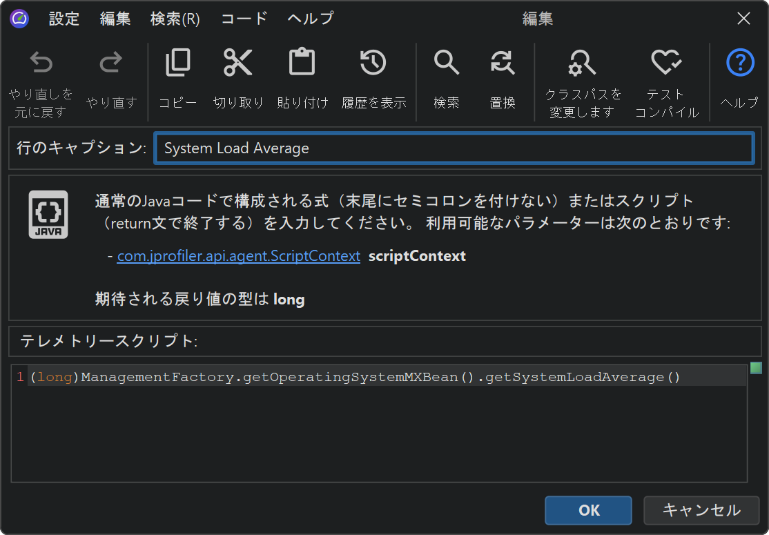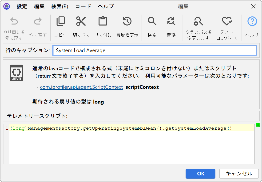 カスタムテレメトリーを追加するには、「テレメトリー」セクションに表示されている テレメトリーの設定 ツールバーボタンをクリックします。 スクリプトテレメトリーでは、現在の JProfiler セッションのクラスパスに設定されている すべてのクラスにアクセスできます。値が直接取得できない場合は、 アプリケーションに static メソッドを追加して、このスクリプトから呼び出せるようにしてください。