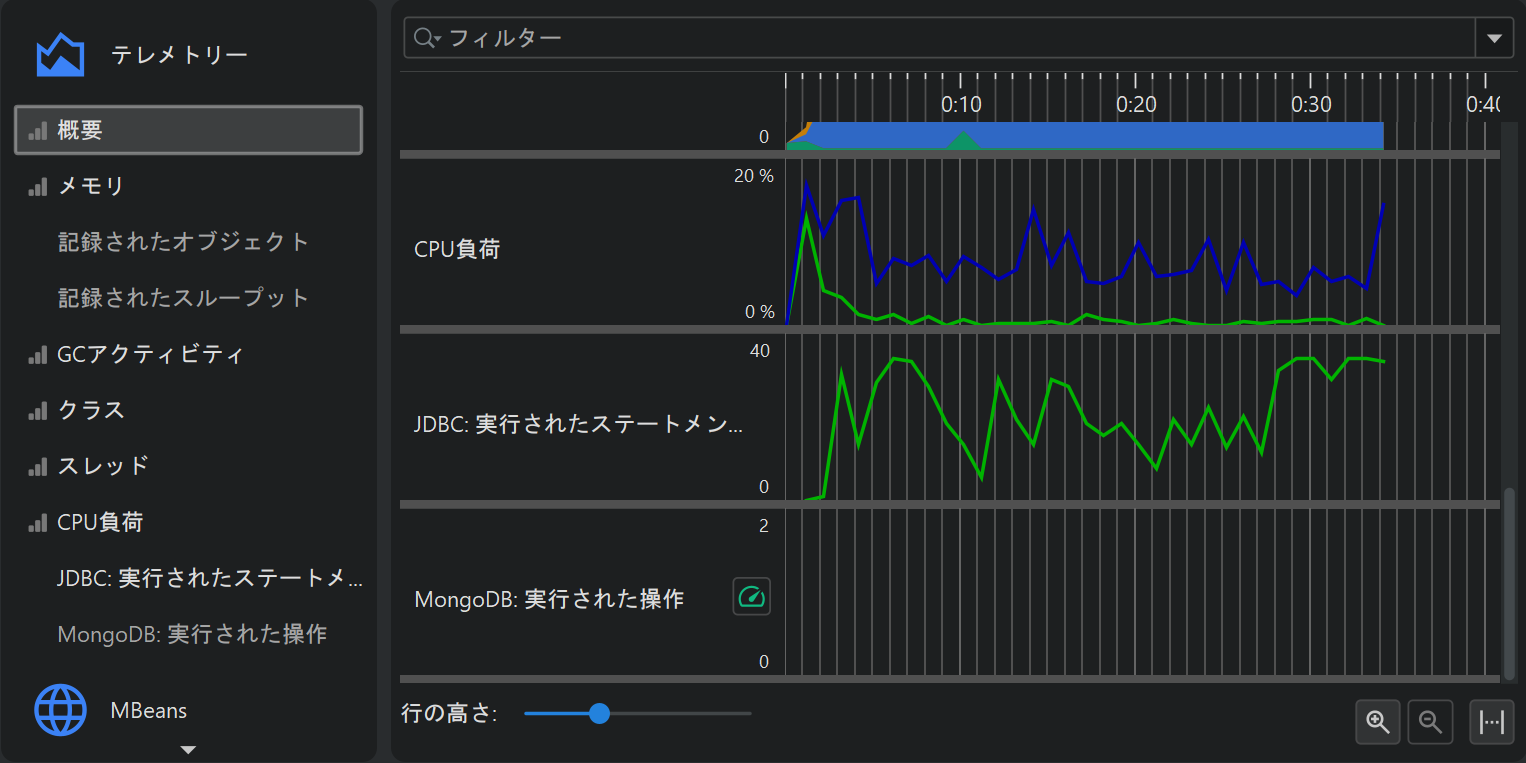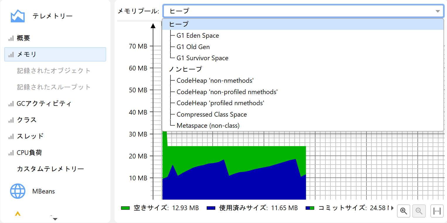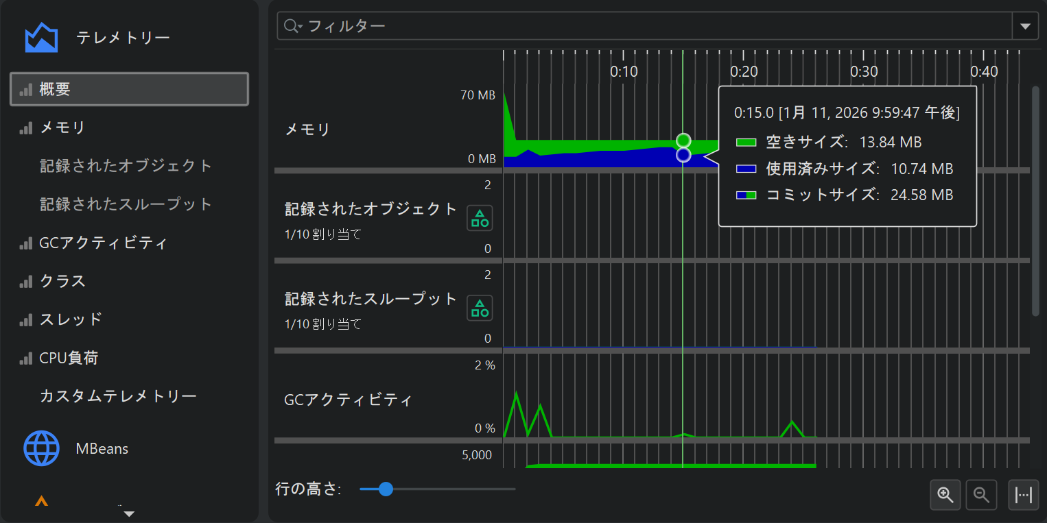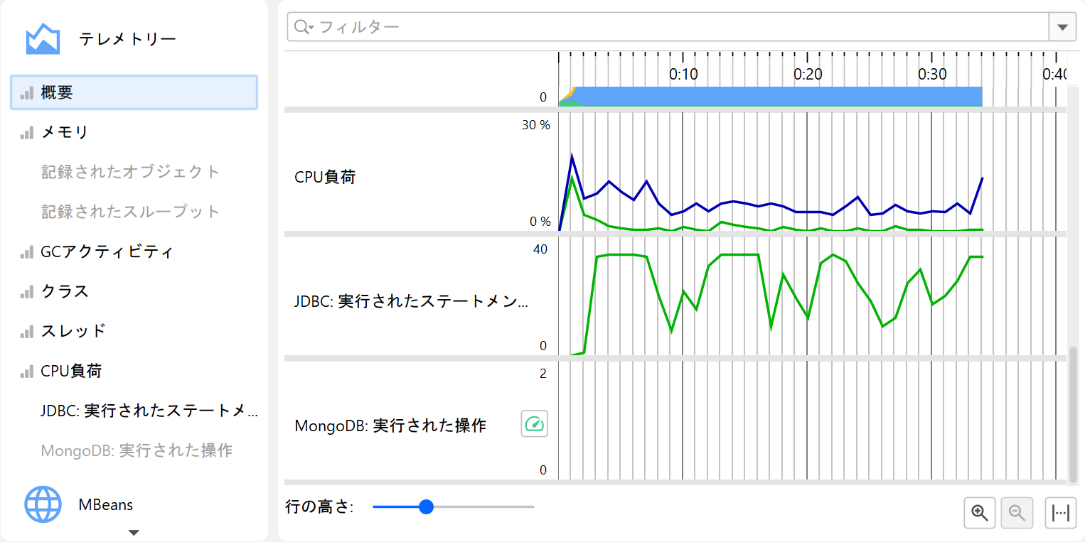 プロファイリングの一側面として、例えば使用ヒープサイズのようなスカラー値の計測値を時間経過とともにモニタリングすることがあります。 JProfiler では、このようなグラフをテレメトリーと呼びます。テレメトリーを観察することで、プロファイルされたソフトウェアの理解が深まり、 複数の計測値にまたがる重要なイベントの相関を確認でき、予期しない挙動に気付いた場合は JProfiler の他のビューでより詳細な解析を行うきっかけになります。
