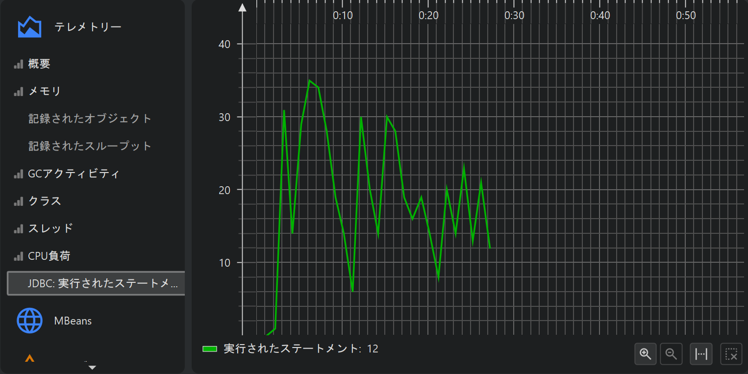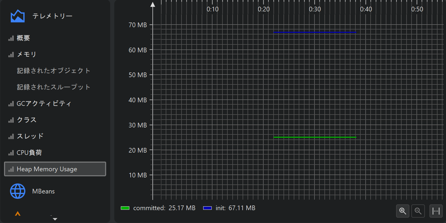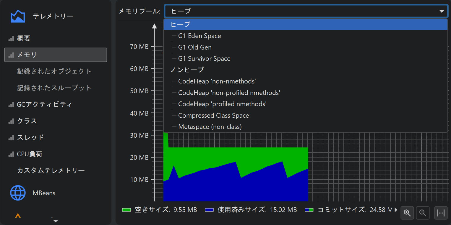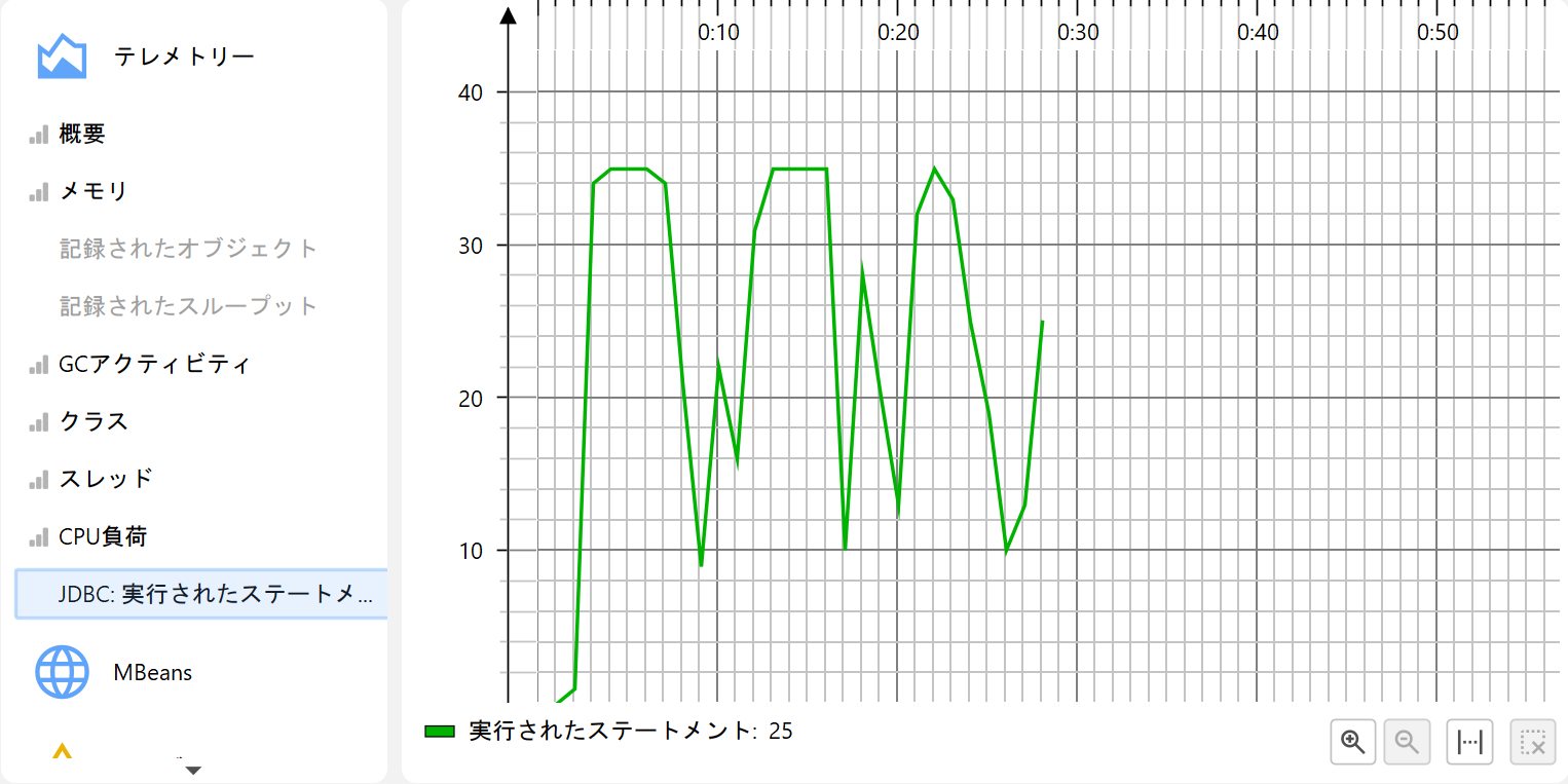 プロファイリングの一側面として、例えば使用ヒープサイズのようなスカラー値の計測値を時間経過とともにモニタリングすることがあります。 JProfiler では、このようなグラフをテレメトリーと呼びます。テレメトリーを観察することで、プロファイルされたソフトウェアの理解が深まり、 複数の計測値にまたがる重要なイベントの相関を確認でき、予期しない挙動に気付いた場合は JProfiler の他のビューでより詳細な解析を行うきっかけになります。