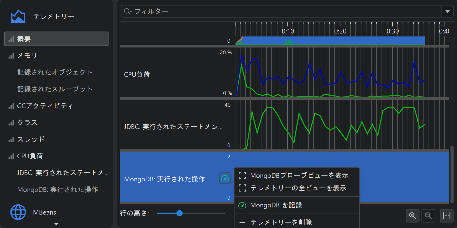 JProfiler UI の「テレメトリー」セクションでは、複数のテレメトリーがデフォルトで記録されます。 インタラクティブセッションでは、常に有効になっています。一部のテレメトリーは、特定の種類のデータが 記録されている必要があります。その場合、テレメトリー内に記録アクションが表示されます。