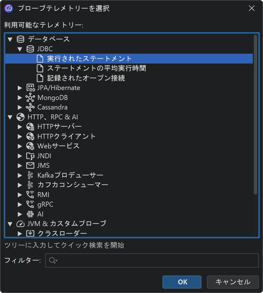 JProfiler には、JVM の高レベルなシステムや主要なフレームワークからイベントを記録する プローブが多数用意されています。プローブには対応する プローブビューで表示されるテレメトリーがあります。これらのテレメトリーをシステムテレメトリーと比較したい場合は、 選択したプローブテレメトリーをトップレベルのテレメトリーセクションに追加できます。 ツールバーから テレメトリーを追加→プローブテレメトリー を選択し、1つ以上のプローブテレメトリーを選びます。