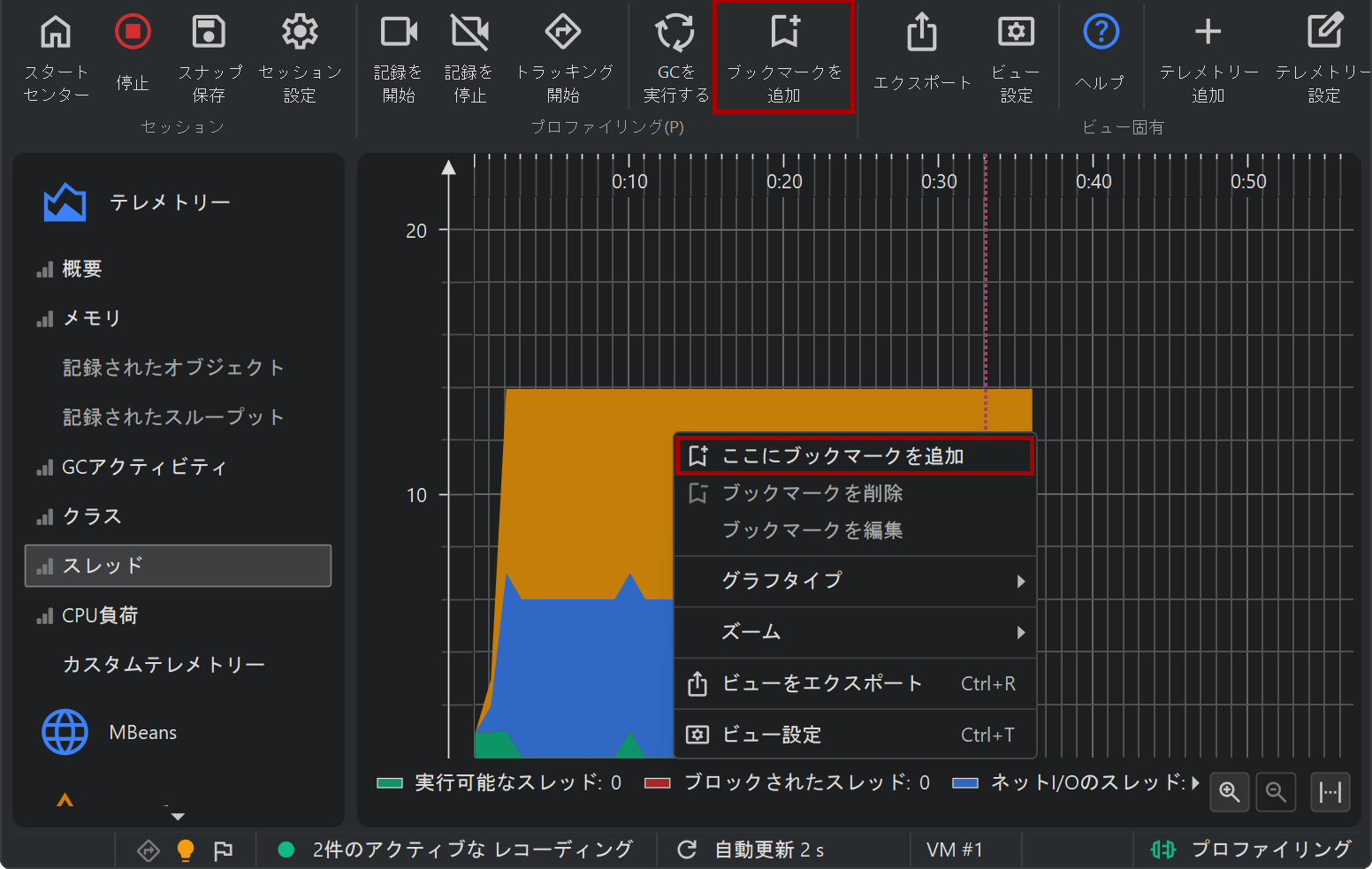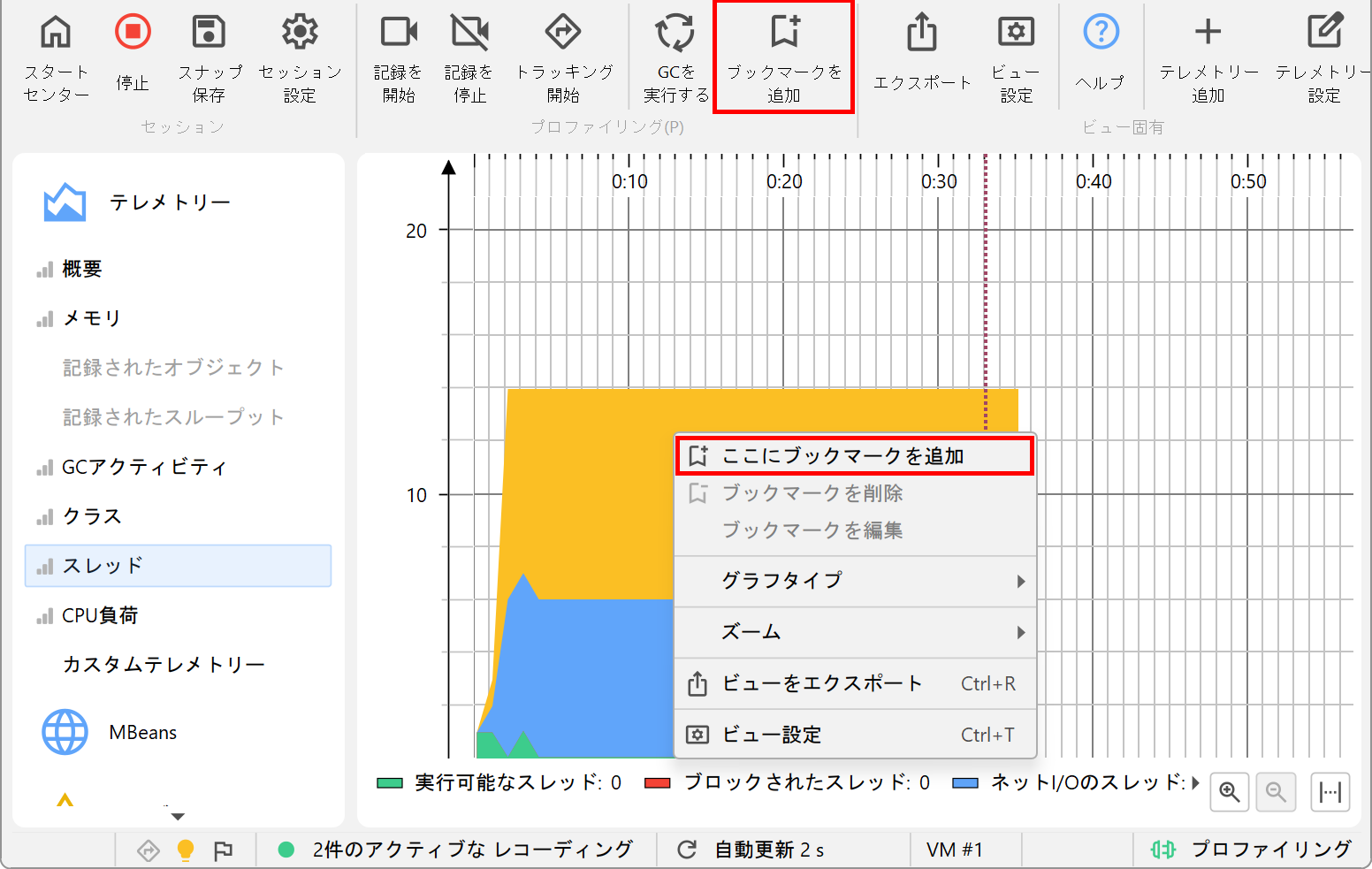 JProfiler は、すべてのテレメトリーで表示されるブックマークのリストを管理しています。インタラクティブセッションでは、 ブックマークを追加 ツールバーボタンをクリックするか、 コンテキストメニューの ここにブックマークを追加 機能を使って、 現在時刻にブックマークを追加できます。