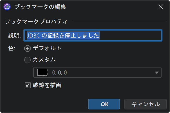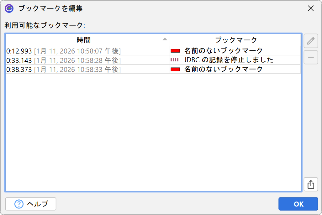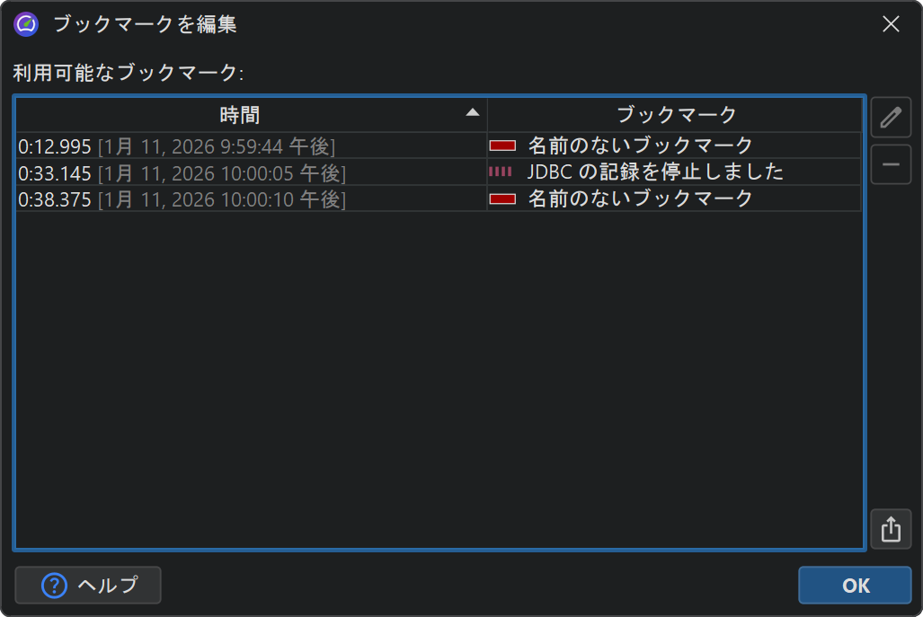 テレメトリー内で複数のブックマークを右クリックするのが面倒な場合は、 メニューの プロファイリング→ブックマークの編集 アクションを使って ブックマークの一覧を表示できます。 ここからブックマークを HTML や CSV にエクスポートすることも可能です。