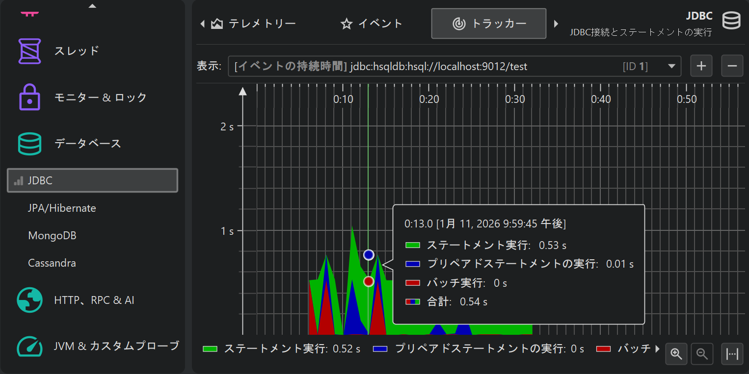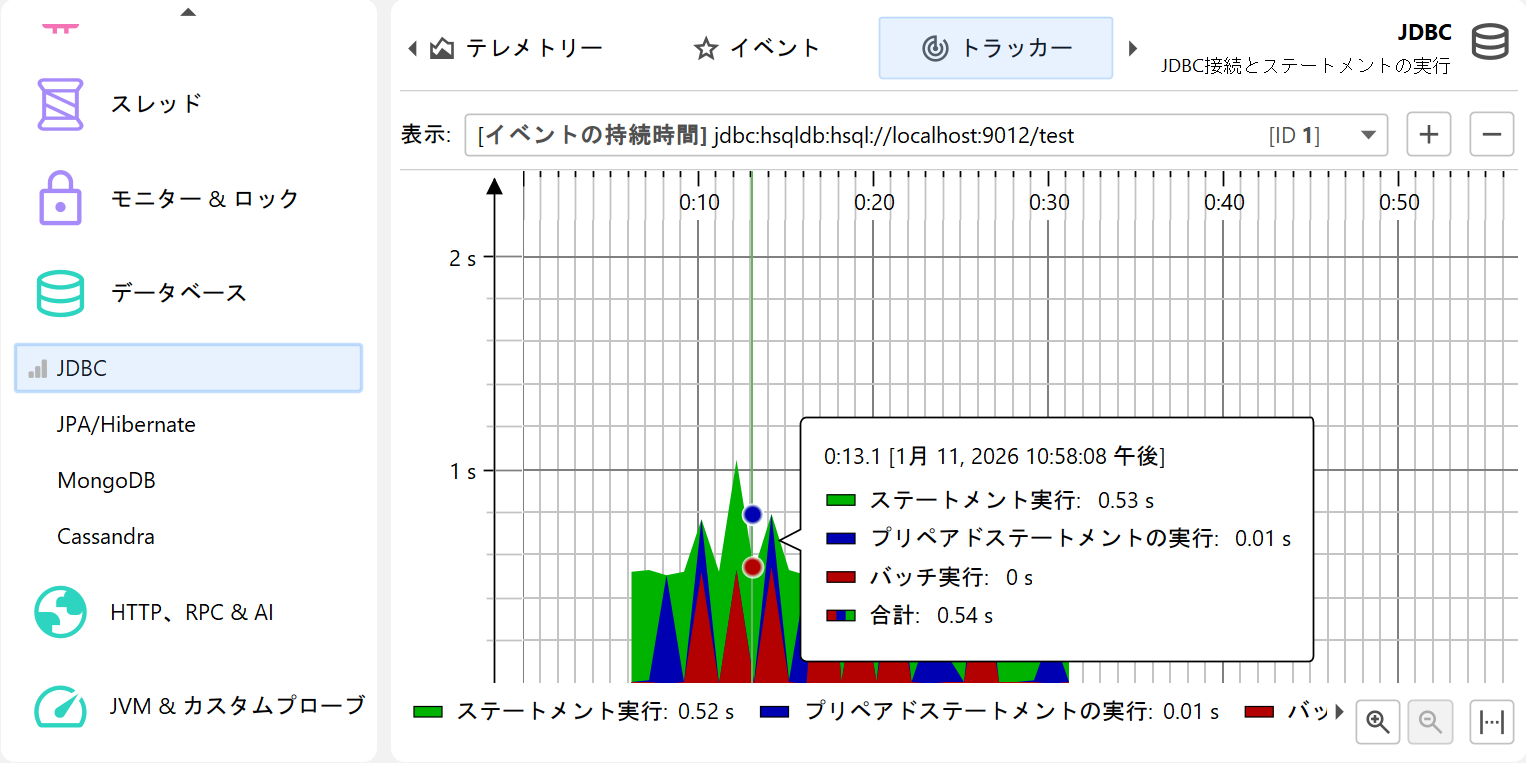 最後に、「トラッキング」テレメトリーとして、他のビューで選択したスカラー値をモニタリングするものがあります。 例えば、クラス・トラッカービューでは、クラスを選択してそのインスタンス数を時間経過でモニタリングできます。 また、各プローブには「トラッカー」ビューがあり、選択したホットスポットや制御オブジェクトをモニタリングできます。