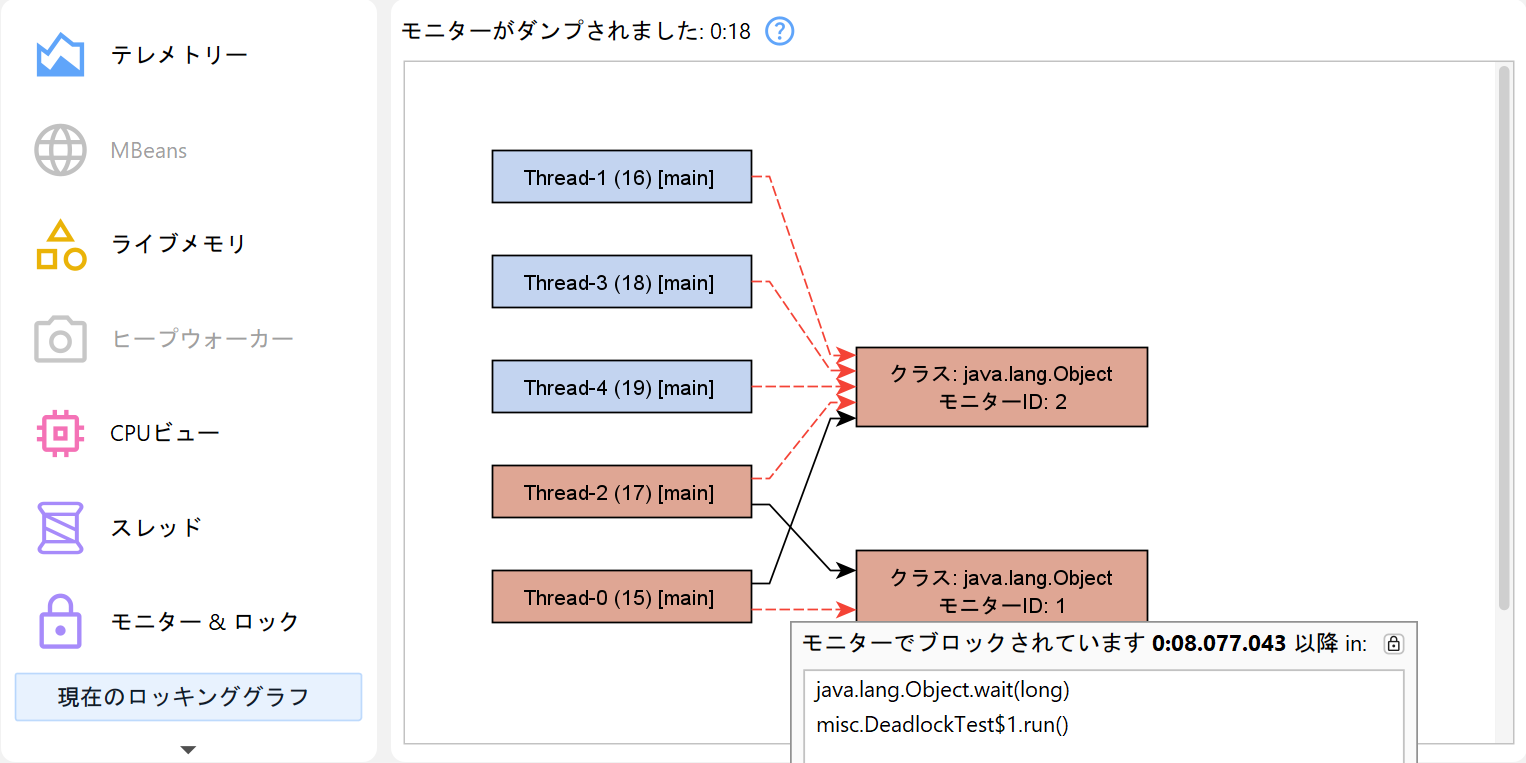 ブロック操作は通常短時間ですが、デッドロックが発生した場合、両ビューで問題が恒久的に表示されます。さらに、現在のロックグラフでは、デッドロックを引き起こしているスレッドとmonitorが赤で表示されるため、すぐに問題を特定できます。