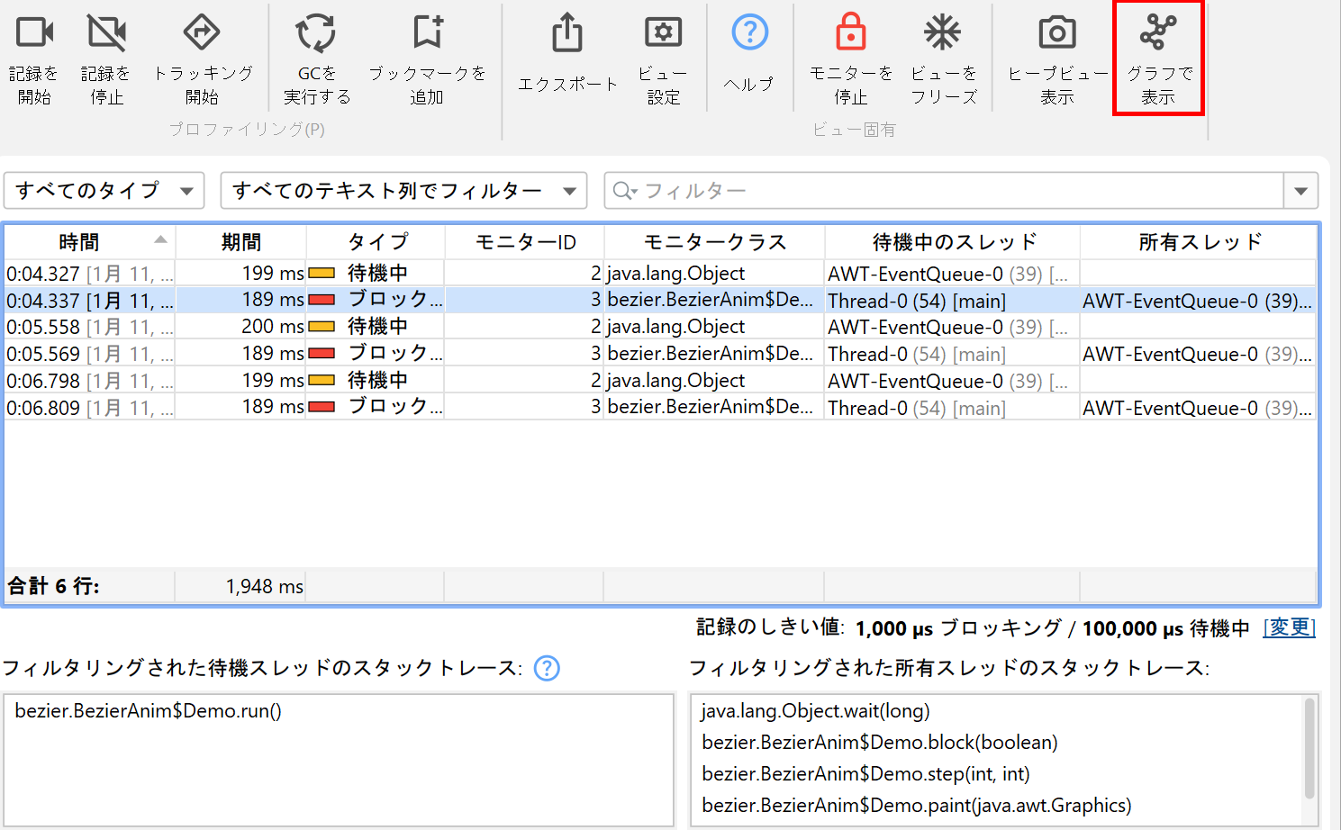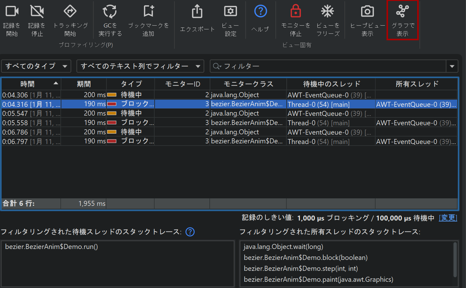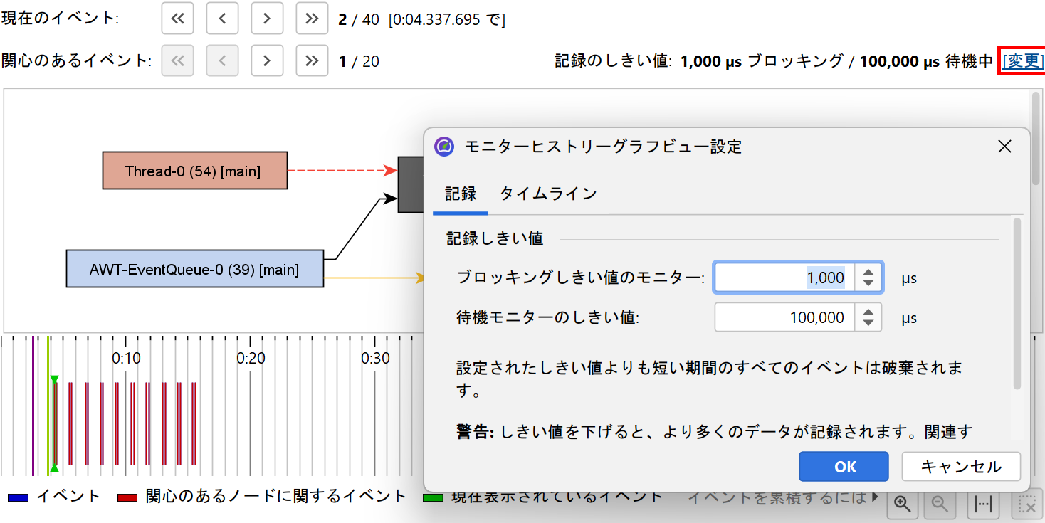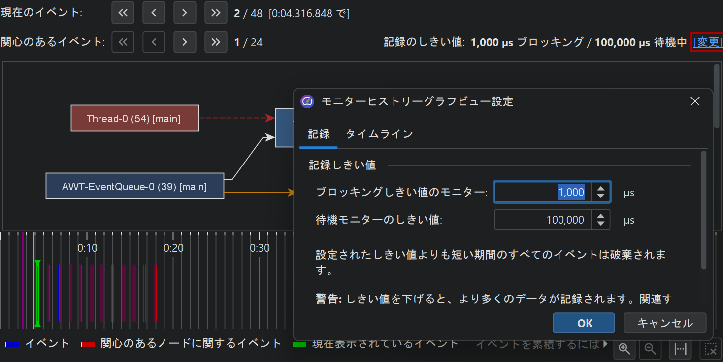 monitorイベントの分析における根本的な問題の1つは、アプリケーションが非常に高頻度でmonitorイベントを生成する場合があることです。そのため、JProfilerでは待機およびブロックイベントに対してデフォルトのしきい値が設定されており、これ未満のイベントは即座に破棄されます。これらのしきい値はビュー設定で定義されており、より長いイベントに注目したい場合は増やすことができます。