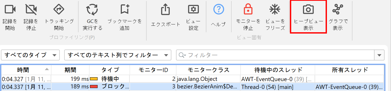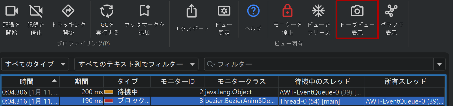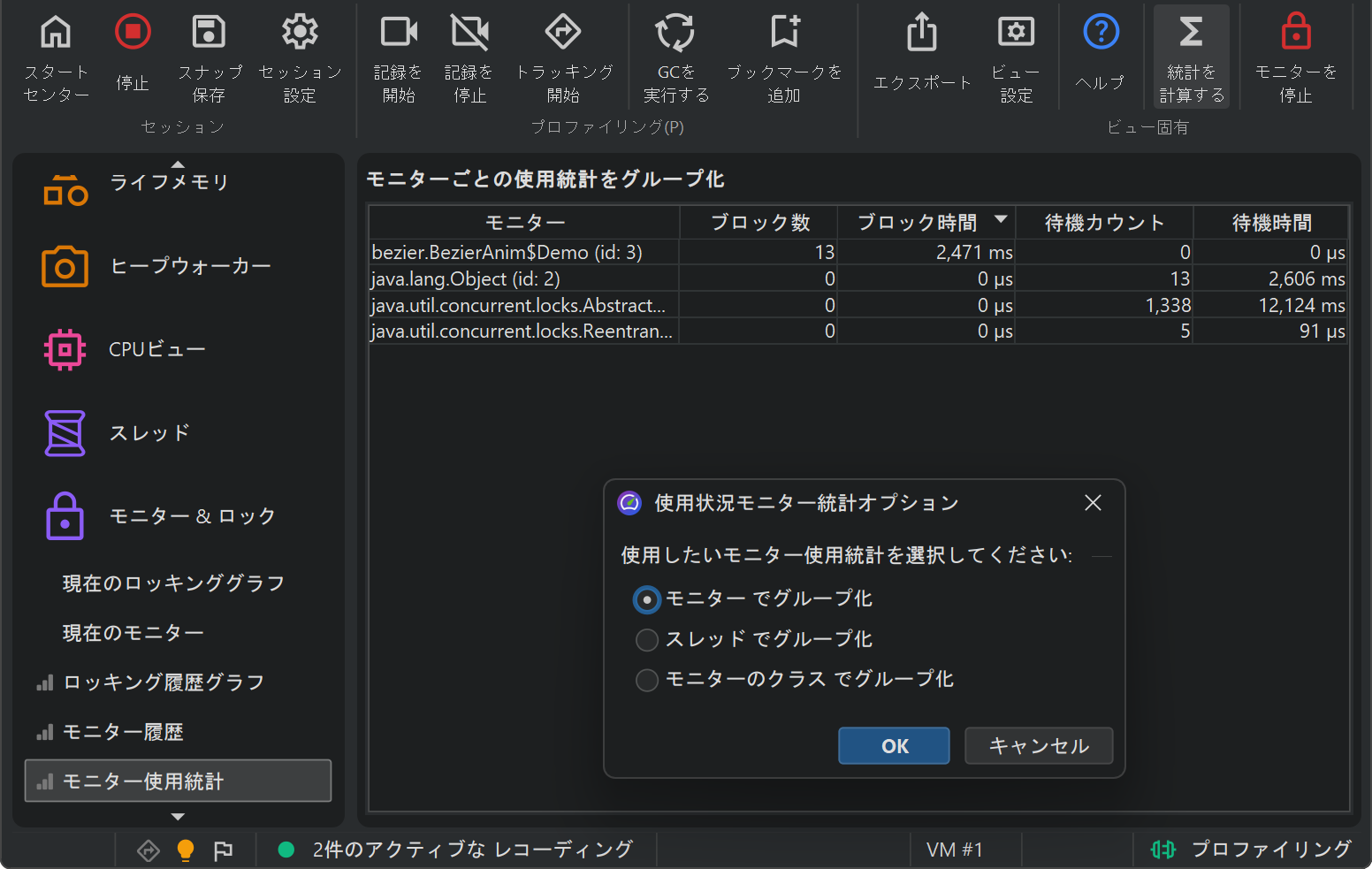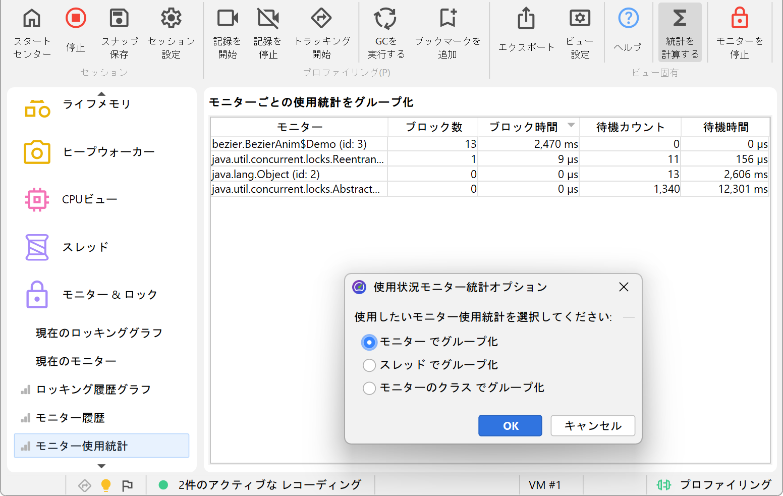 ブロックや待機操作をより高い視点から調査するために、monitor統計ビューではmonitor記録データからレポートを生成します。monitorイベントをmonitor、スレッド名、またはmonitorのクラスごとにグループ化し、各行の累積回数や継続時間を分析できます。