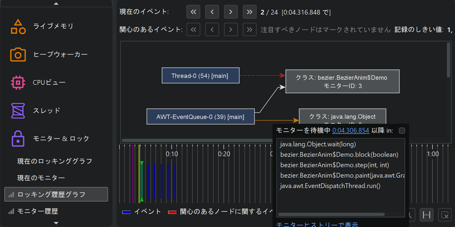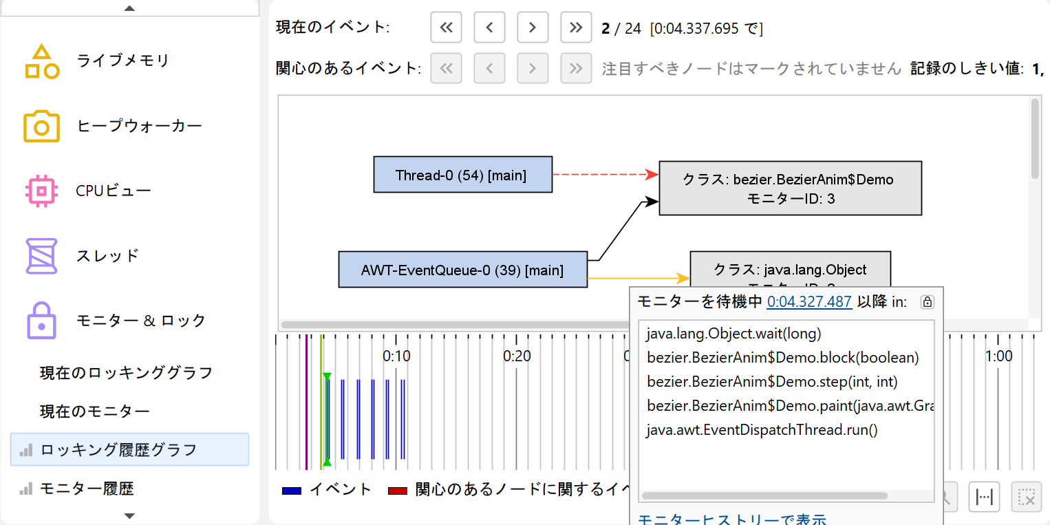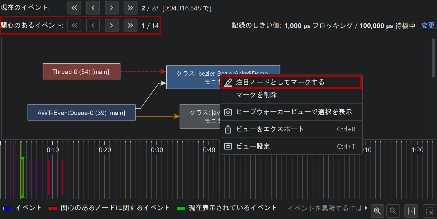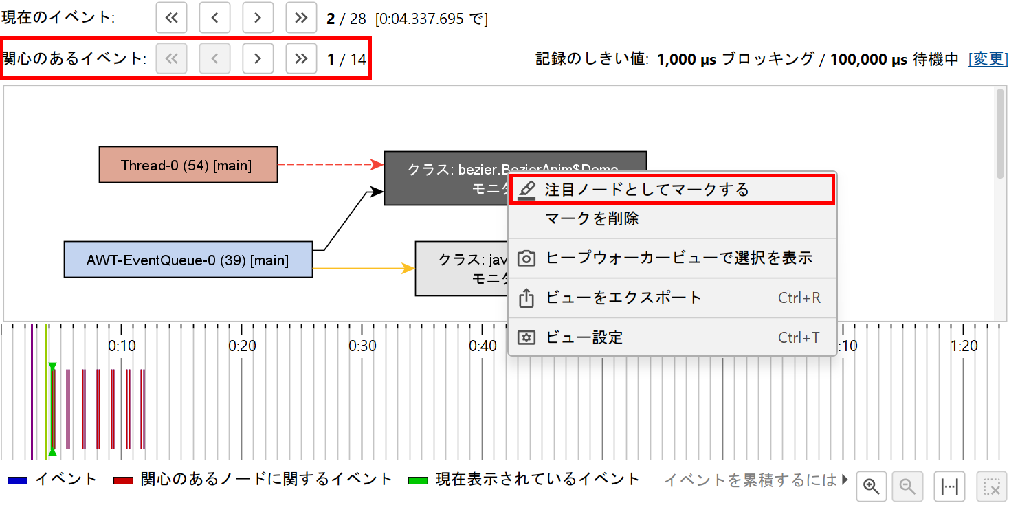 記録されたイベントには、さらにフィルタを適用できます。monitor履歴ビューでは、しきい値、イベントタイプ、テキストフィルタがビュー上部に用意されています。ロック履歴グラフでは、注目するスレッドまたはmonitorを選択し、それらが関与するロック状況のみを表示できます。注目イベントはタイムライン上で異なる色で表示され、セカンダリナビゲーションバーでそれらのイベントを順番に移動できます。現在のイベントが注目イベントでない場合、現在のイベントと次の注目イベントの間にいくつイベントがあるかを両方向で確認できます。