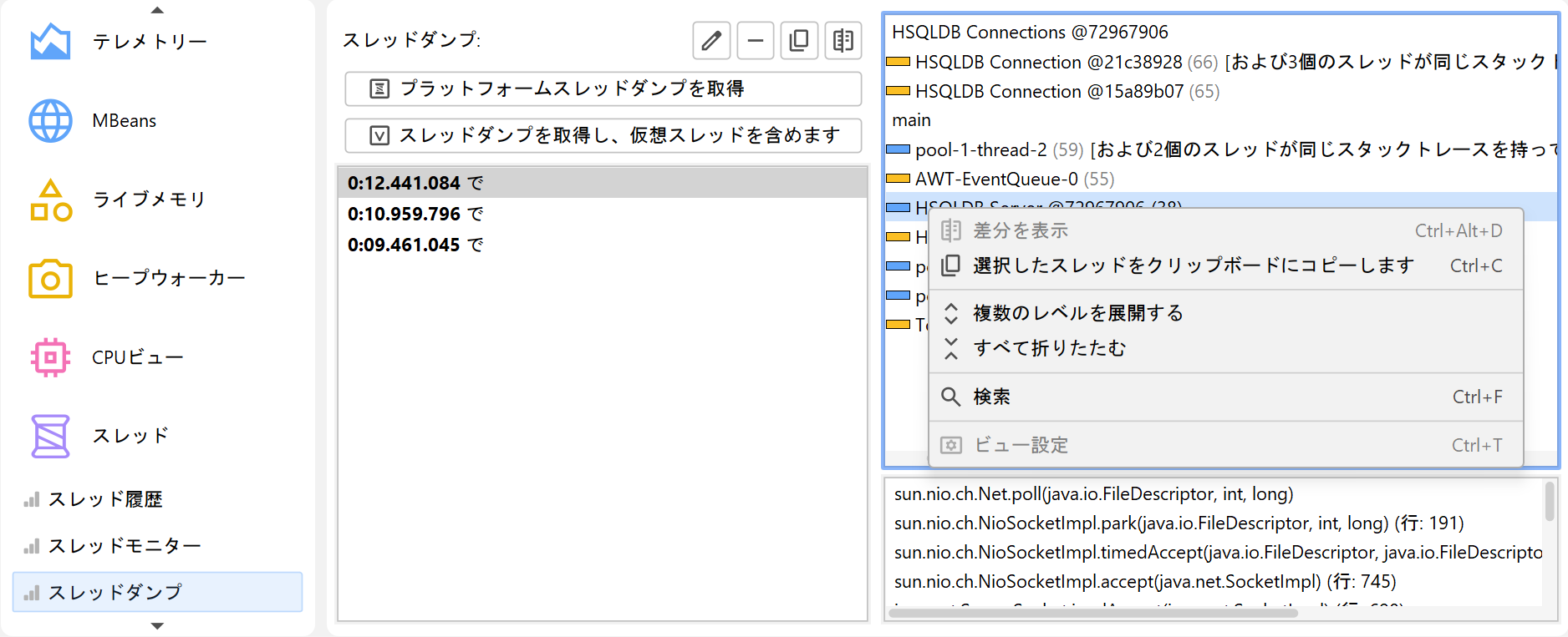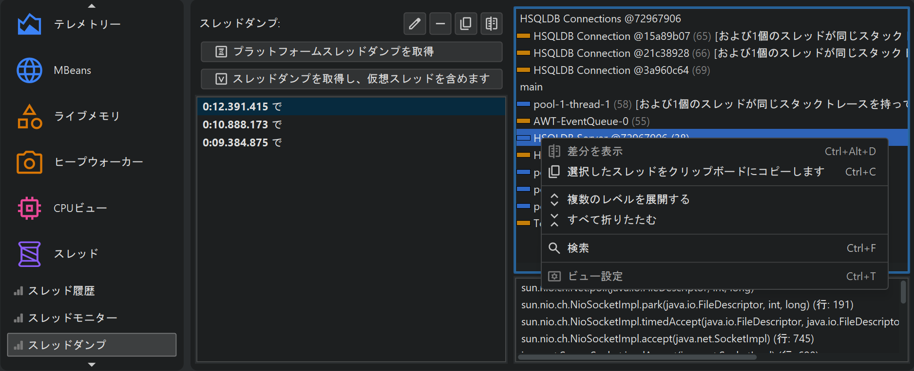 多くのデバッガと同様に、JProfilerでもスレッドダンプを取得できます。スレッドダンプのスタックトレースはJVMが提供する完全なスタックトレースであり、CPU記録には依存しません。異なるスレッドダンプは、2つ選択してShow Differenceボタンをクリックするとdiffビューアで比較できます。また、1つのスレッドダンプ内の2つのスレッドを選択し、コンテキストメニューからShow Differenceを選ぶことで比較することも可能です。