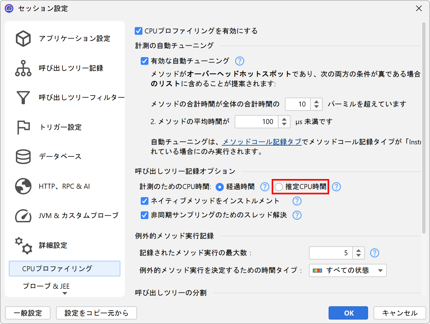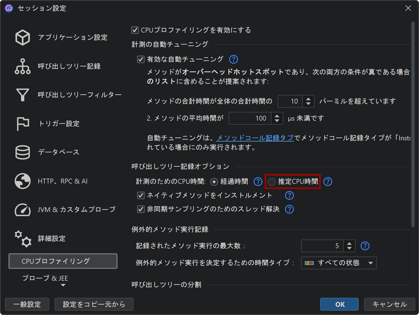 プロファイリング設定で推定CPU時間の記録を有効にすると、テーブルにCPU Time列が追加されます。CPU時間はCPUデータを記録している場合のみ計測されます。