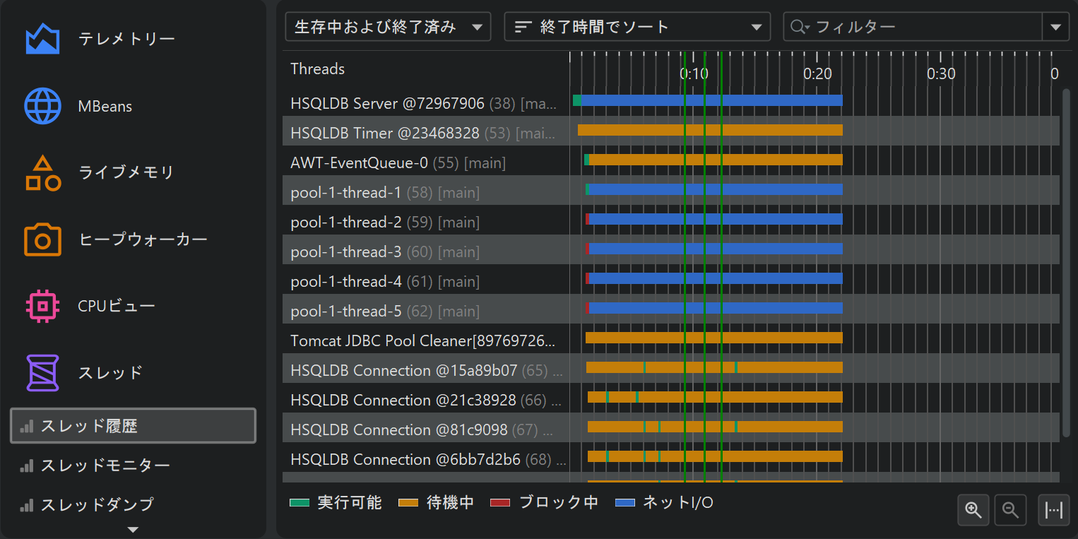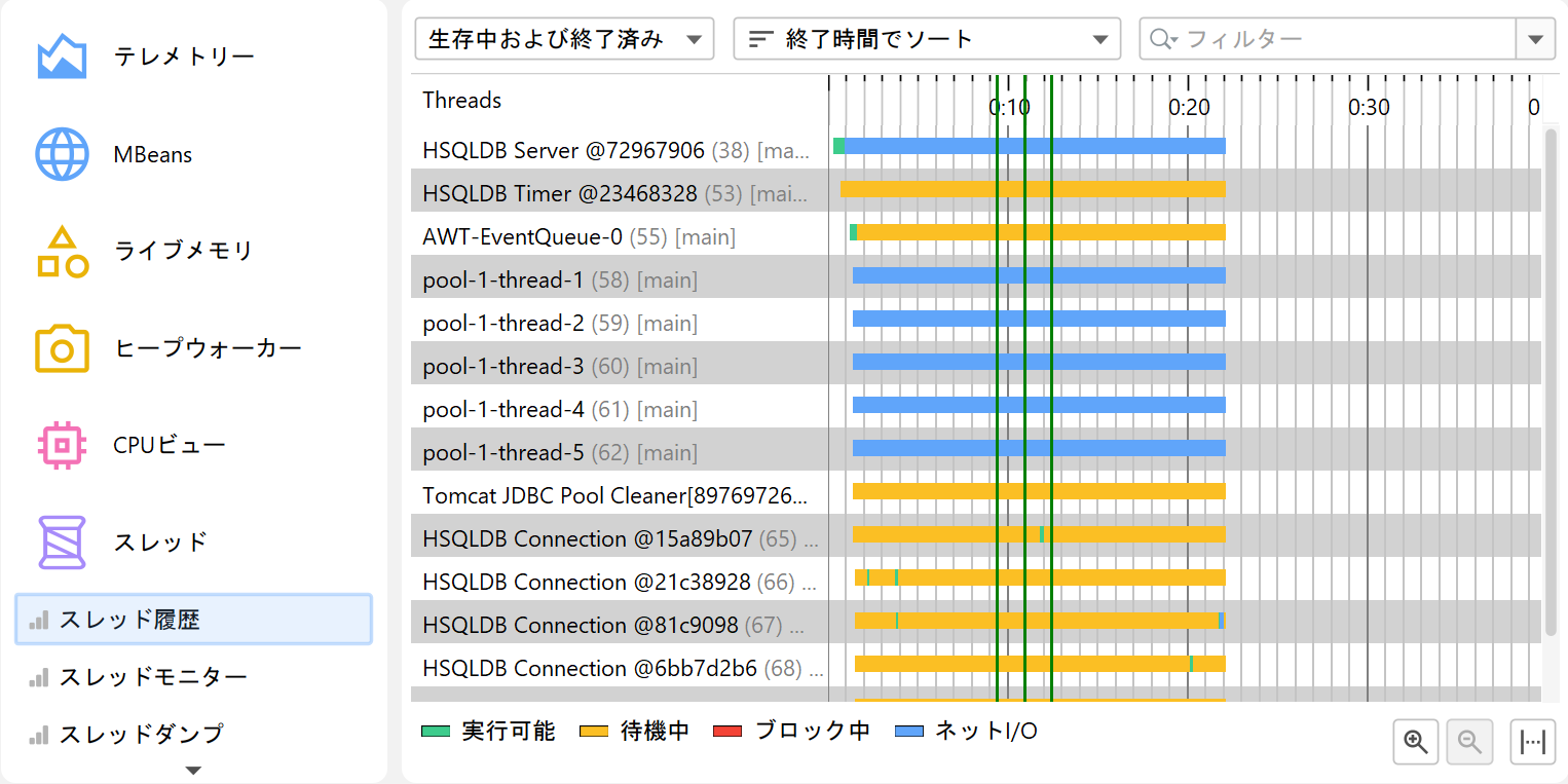 スレッド履歴ビューでは、各スレッドがタイムライン上の色付きの行として表示され、色は記録されたスレッド状態を示します。スレッドは作成時刻、名前、またはスレッドグループでソートでき、名前でフィルタリングすることも可能です。また、ドラッグ&ドロップでスレッドの順序を自由に並べ替えることもできます。monitorイベントが記録されている場合、「Waiting」や「Blocked」状態だった部分にマウスオーバーすると、関連するスタックトレースが表示され、monitor履歴ビューへのリンクも確認できます。