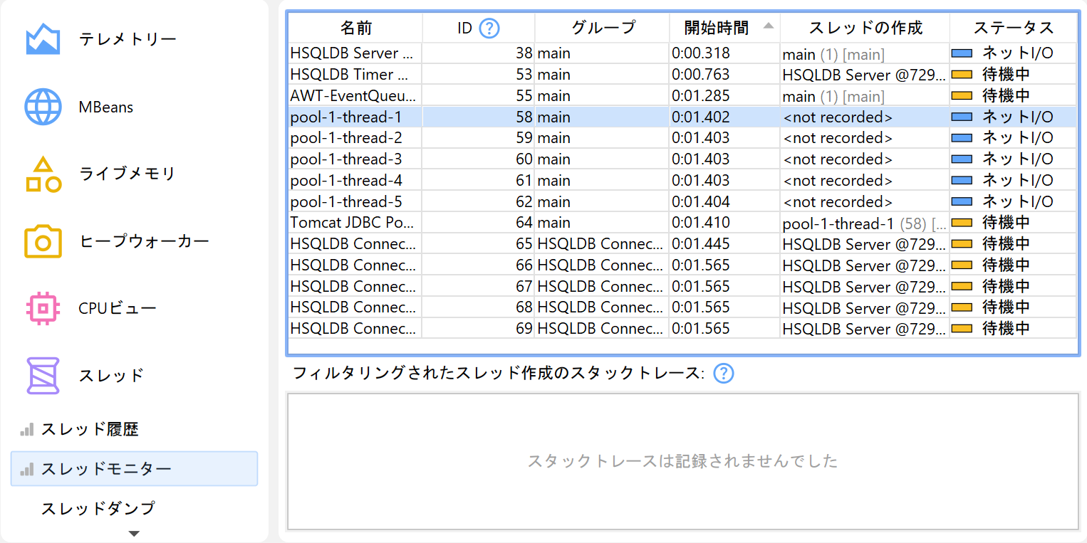 すべてのスレッドの表形式ビューは、スレッドmonitorビューで利用できます。スレッド作成時にCPU記録が有効になっている場合、JProfilerは作成元スレッドの名前を保存し、テーブルに表示します。下部には作成元スレッドのスタックトレースが表示されます。パフォーマンス上の理由から、JVMから実際のスタックトレースは取得せず、CPU記録の現在の情報を使用します。つまり、スタックトレースには呼び出しツリー収集のフィルタ設定を満たすクラスのみが表示されます。
