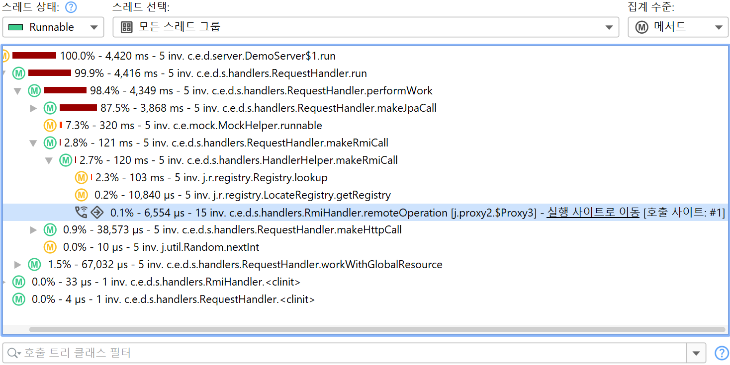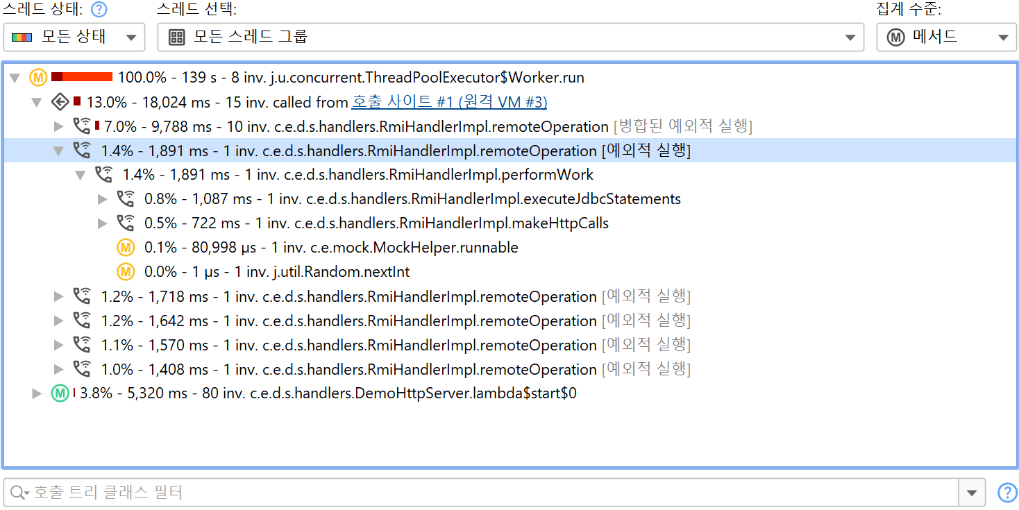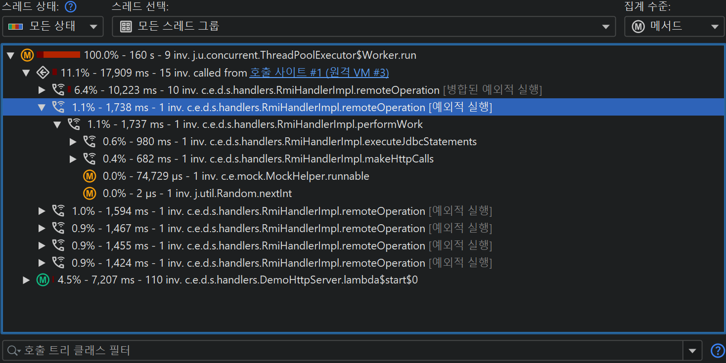 동일한 호출 사이트가 동일한 실행 사이트를 반복적으로 호출하는 경우, 실행 사이트에는 모든 호출의 병합된 호출 트리가 표시됩니다. 만약 이를 원하지 않는 경우, 예외적인 메소드 기능을 사용하여 아래 스크린샷과 같이 호출 트리를 추가로 분할할 수 있습니다.