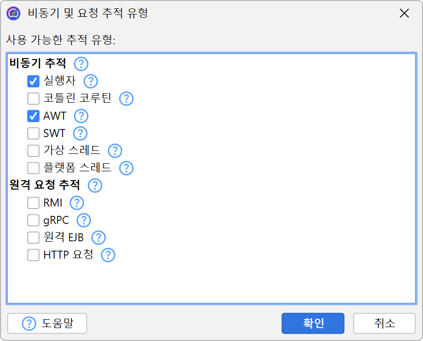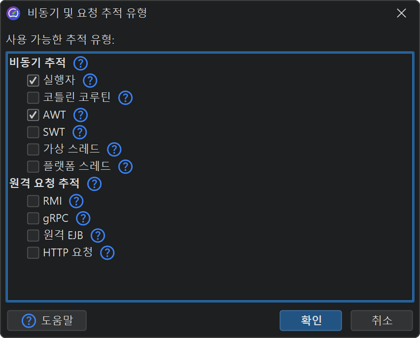 비동기 메커니즘은 다양한 방식으로 구현될 수 있으며, 별도의 thread 또는 다른 JVM에서 태스크를 시작하는 의미론은 일반적인 방법으로 감지할 수 없습니다. JProfiler는 여러 일반적인 비동기 및 원격 요청 기술을 명시적으로 지원합니다. 요청 추적 설정에서 이들을 활성화하거나 비활성화할 수 있습니다. 기본적으로 요청 추적은 활성화되어 있지 않습니다. 또한 세션 시작 직전에 표시되는 세션 시작 대화상자에서 요청 추적을 구성할 수도 있습니다.
