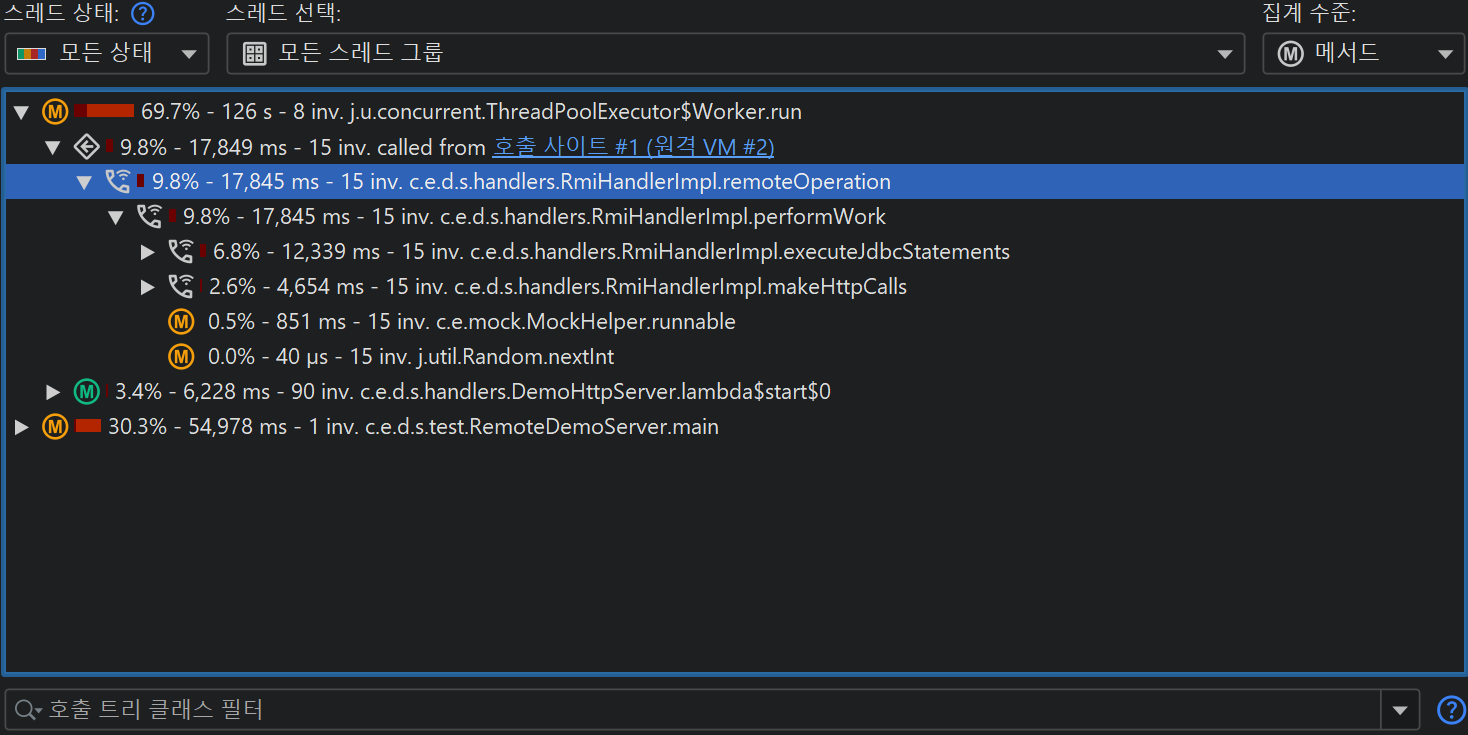 호출 사이트는 모든 thread에 대해 원격 요청 추적에서 동일한 ID를 가집니다. 즉, 호출 사이트와 실행 사이트를 오갈 때 thread 해상도가 필요 없으며, 항상 "모든 thread 그룹" 및 "모든 thread 상태" thread 상태 선택이 활성화되어 대상이 표시된 트리의 일부가 되도록 보장됩니다.