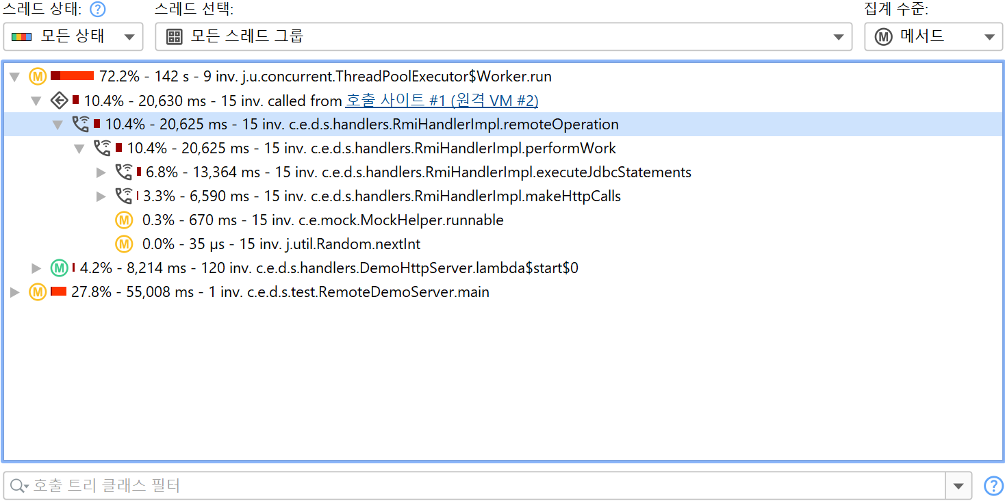 JProfiler는 호출이 동일한 JVM 내에 머무르는지 여부에 따라 이 문제에 대한 다양한 솔루션을 제공합니다. 비동기 실행이 호출한 JVM과 동일한 JVM에서 발생하는 경우, "Inline Async Executions" 호출 트리 분석은 호출 사이트와 실행 사이트 모두를 포함하는 단일 호출 트리를 계산합니다. 원격 JVM으로 요청이 전송되는 경우, 호출 트리에는 호출 사이트와 실행 사이트로의 하이퍼링크가 포함되어 있어, 관련된 JVM들의 프로파일링 세션을 보여주는 JProfiler의 서로 다른 최상위 창 사이를 양방향으로 원활하게 탐색할 수 있습니다.