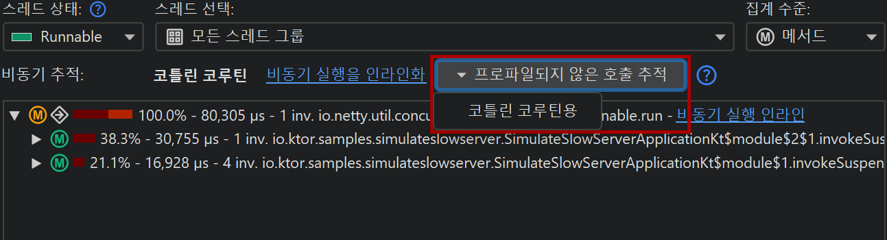 마지막으로, JProfiler는 Kotlin coroutine도 지원합니다. Kotlin의 멀티스레딩 솔루션으로, 모든 Kotlin 백엔드에서 구현되어 있습니다. 비동기 실행 자체는 coroutine이 시작되는 지점입니다. Kotlin coroutine의 디스패치 메커니즘은 유연하여, 실제로 현재 thread에서 시작될 수도 있는데, 이 경우 "비동기 실행" 노드에 인라인 부분이 추가되어 노드의 텍스트에 별도로 표시됩니다.