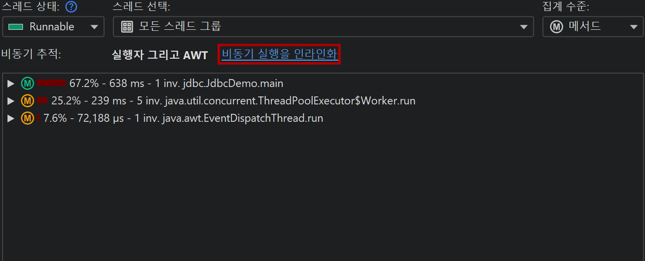 하나 이상의 비동기 추적 유형이 활성화된 경우, CPU, 할당, 프로브 녹화에 대한 호출 트리 및 핫스팟 뷰에서 모든 활성화된 추적 유형에 대한 정보를 "Inline Async Executions" 호출 트리 분석을 계산하는 버튼과 함께 보여줍니다. 해당 분석의 결과 뷰에서는 모든 비동기 실행의 호출 트리가 호출 사이트와 "비동기 실행" 노드를 통해 연결됩니다. 기본적으로 비동기 실행 측정값은 호출 트리의 상위 노드에 더해지지 않습니다. 집계된 값을 보는 것이 유용한 경우도 있으므로, 분석 상단의 체크박스를 통해 필요에 따라 이를 활성화할 수 있습니다.