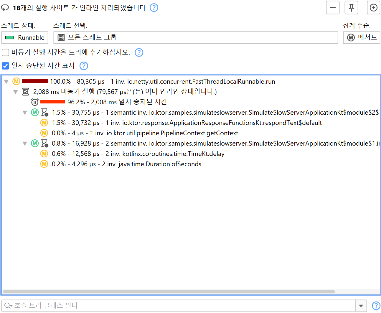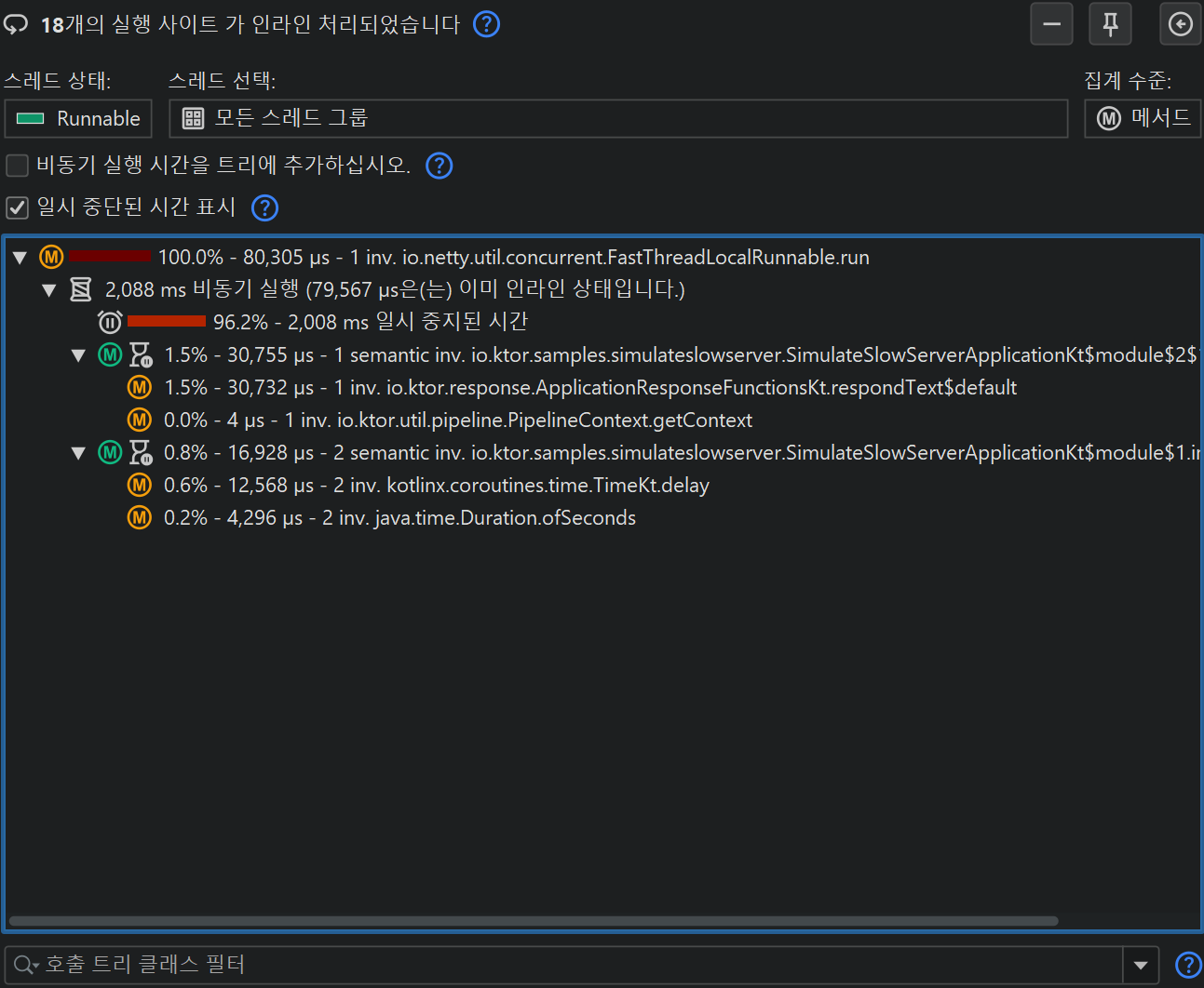 suspend 메서드는 실행을 중단할 수 있으며, 이후 다른 thread에서 재개될 수 있습니다. suspend가 감지된 메서드에는 "suspend" 아이콘이 추가로 표시되며, 툴팁에는 실제 호출 횟수와 의미론적 호출 횟수가 표시됩니다. Kotlin coroutine은 의도적으로 suspend될 수 있지만, thread에 바인딩되어 있지 않으므로 대기 시간은 호출 트리 어디에도 나타나지 않습니다. coroutine 실행이 완료될 때까지 걸린 전체 시간을 확인하려면, "비동기 실행" 노드 아래에 "suspended" 시간 노드가 추가되어 coroutine의 전체 suspend 시간을 캡처합니다. 비동기 실행의 CPU 시간 또는 wall clock 시간 중 어떤 것에 관심이 있는지에 따라, 분석 상단의 "Show suspended times" 체크박스를 통해 해당 노드를 실시간으로 추가하거나 제거할 수 있습니다.