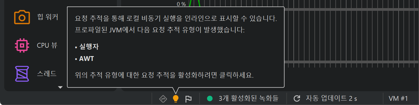 JProfiler는 프로파일된 JVM에서 활성화되지 않은 비동기 요청 추적 유형이 사용되는 경우 알림 아이콘을 상태 표시줄의 비동기 및 원격 요청 추적 아이콘 옆에 표시합니다. 알림 아이콘을 클릭하면 감지된 추적 유형을 활성화할 수 있습니다. 비동기 및 원격 요청 추적은 상당한 오버헤드를 유발할 수 있으므로 필요한 경우에만 활성화해야 합니다.