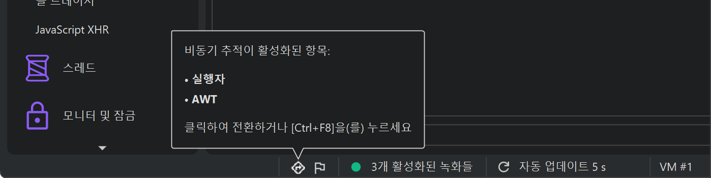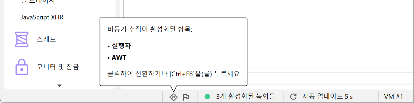 JProfiler의 메인 창에서는 상태 표시줄을 통해 일부 비동기 및 원격 요청 추적 유형이 활성화되어 있는지 표시하며, 설정 대화상자로 바로 이동할 수 있는 바로가기를 제공합니다.