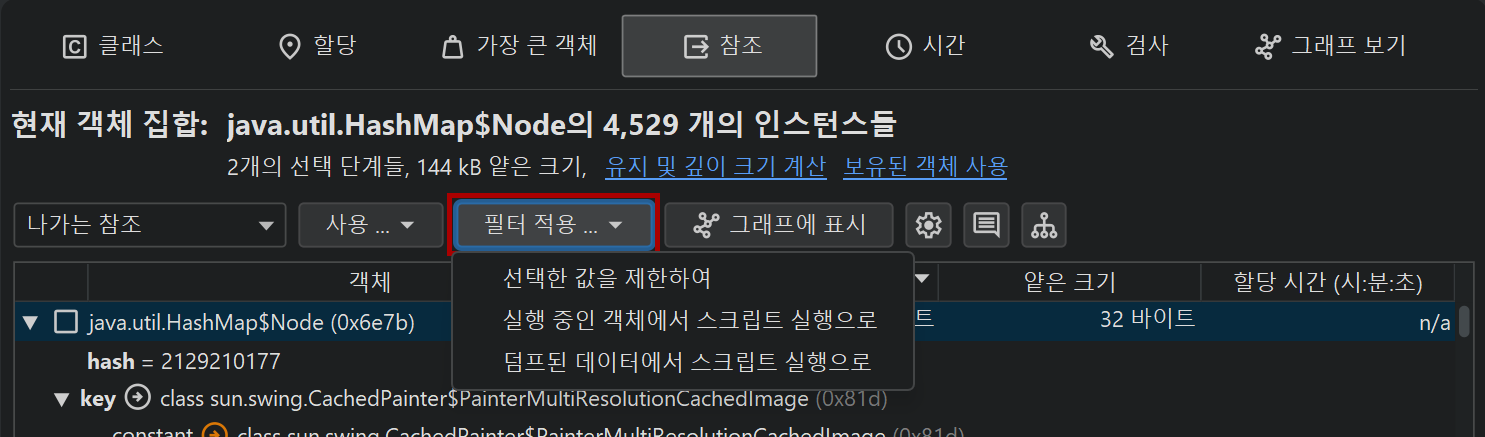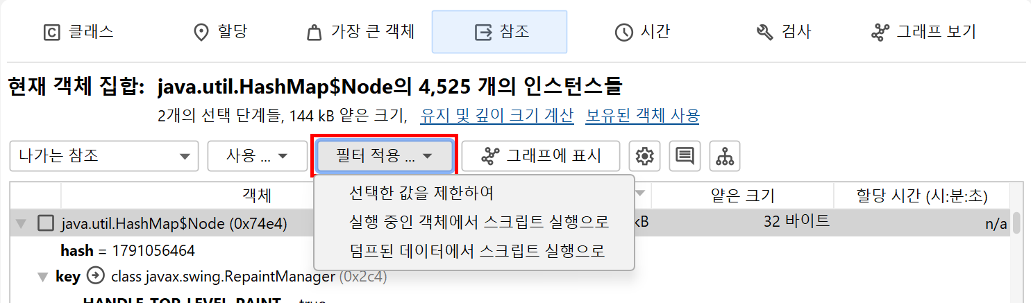 이러한 필터 스크립트에서는 HeapObject 매개변수의 메소드를 통해 모든 들어오는 및 나가는 참조에 액세스할 수도 있습니다.
