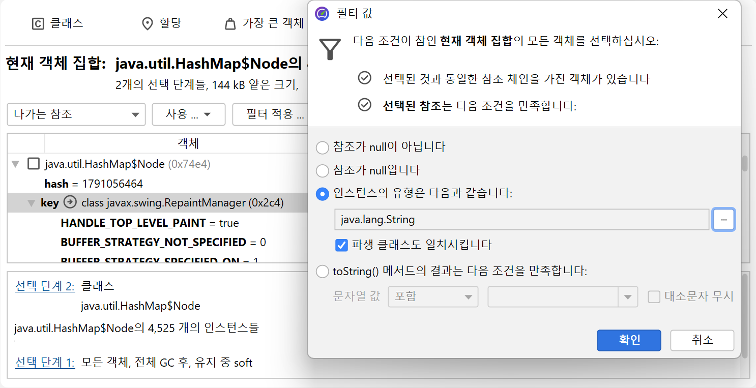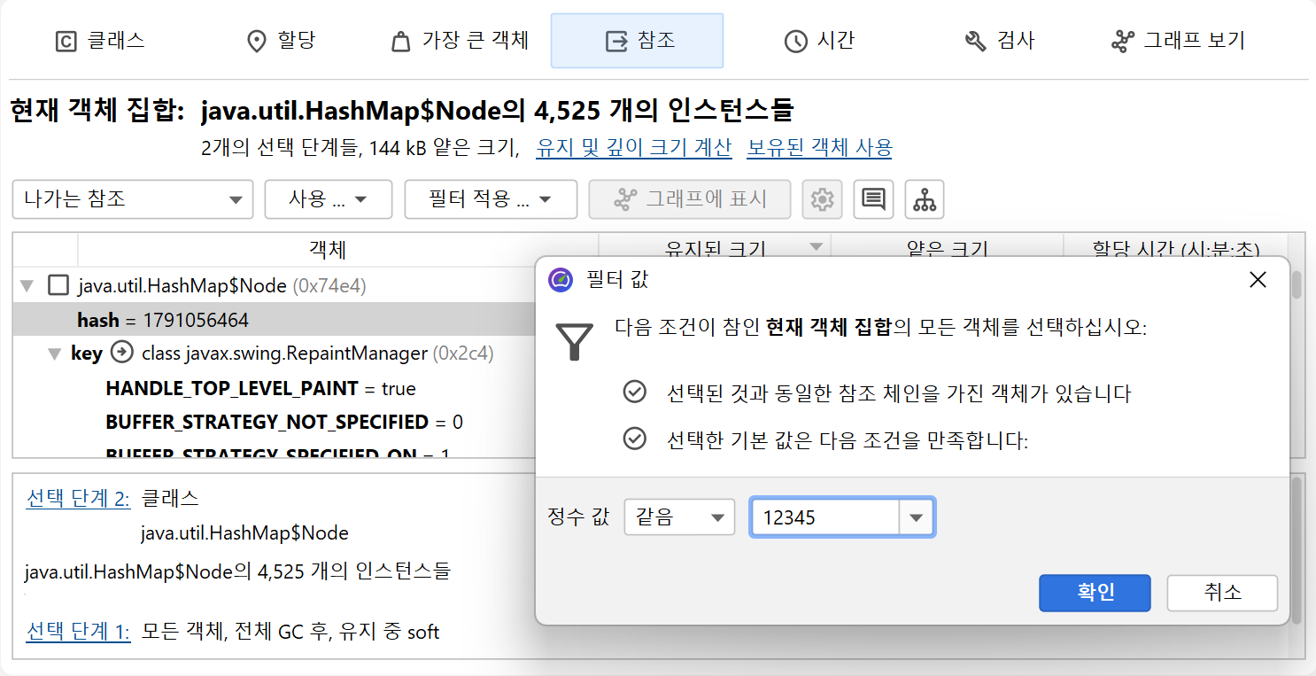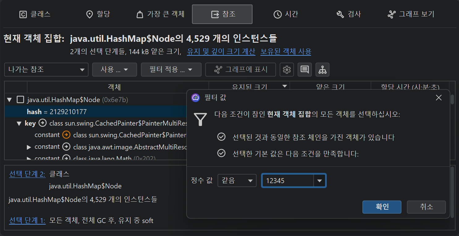원시 값 제한은 HPROF 및 JProfiler 힙 스냅샷 모두에서 작동합니다. 참조 유형의 경우, JProfiler에 null이 아닌 값, null 값 및 선택한 클래스의 값을 필터링하도록 요청할 수
