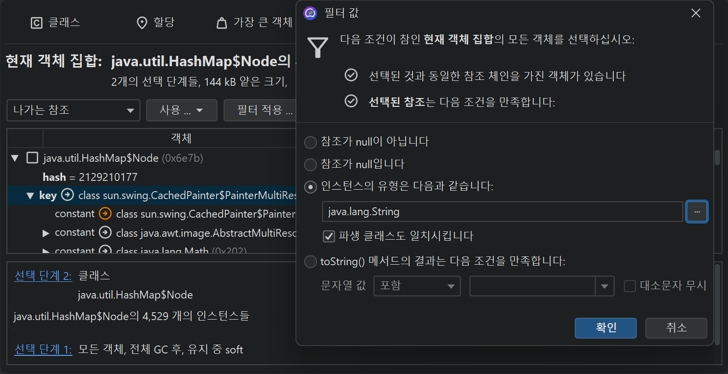 힙 워커에서 관심 있는 객체를 찾을 때, 동일한 클래스의 인스턴스가 너무 많은 객체 집합에 도달하는 경우가 많습니다. 특정 초점에 따라 객체 집합을 더 줄이기 위해 선택 기준은 해당 속성이나 참조를 포함할 수 있습니다. 예를 들어, 특정 속성을 포함하는 HTTP 세션 객체에 관심이 있을 수 있습니다. 힙 워커의 병합된 나가는 참조 뷰에서 전체 객체 집합에 대한 참조 체인을 포함하는 선택 단계를 수행할 수 있습니다.