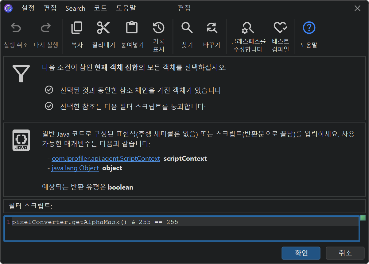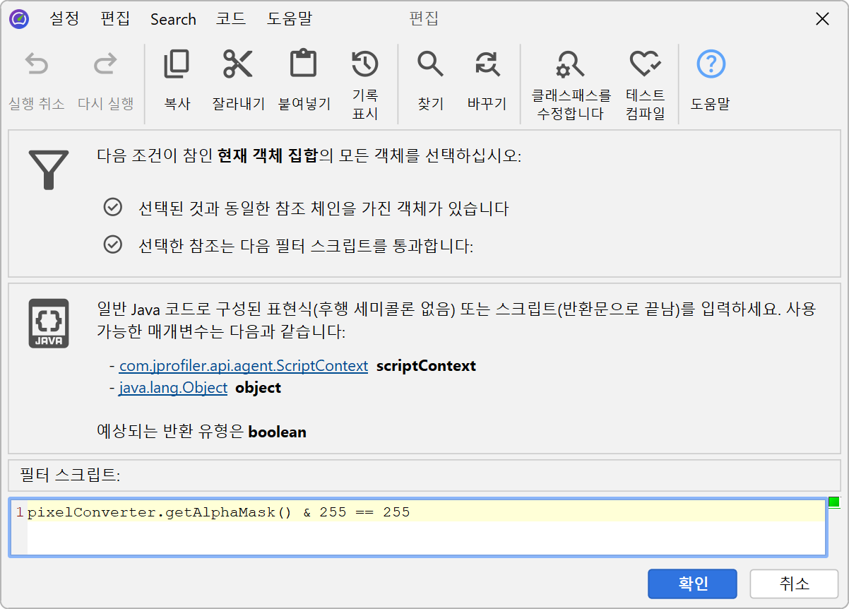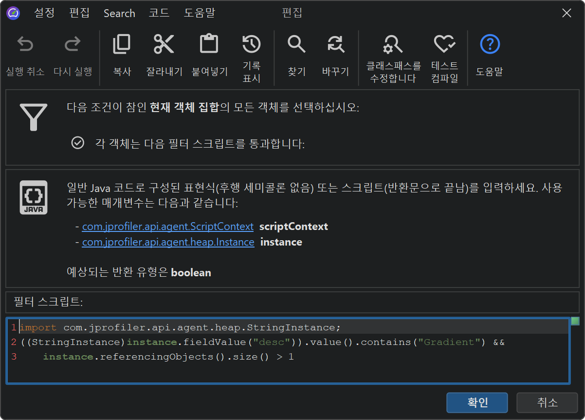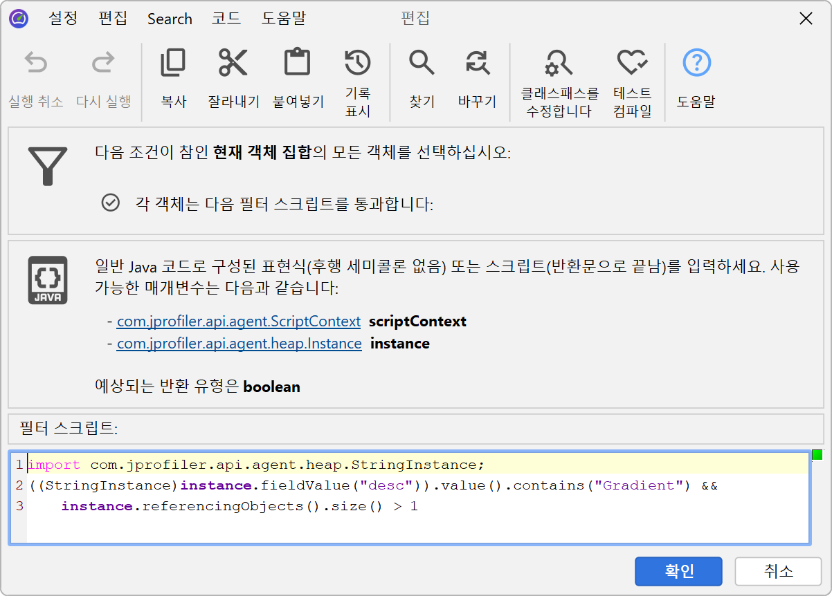 라이브 세션에서는 JProfiler가 프로파일된 JVM에서 필터링 스크립트를 실행하고 실제 인스턴스를 스크립트에 전달할 수 있습니다. 라이브 객체에서 스크립트를 실행하여 필터 적용에 의해 표시되는 스크립트 편집기에서 속성에 직접 액세스하고 부울 반환 값이 인스턴스를 현재 객체 집합에 유지할지 여부를 결정하는 표현식이나 스크립트를 작성할 수 있습니다.
