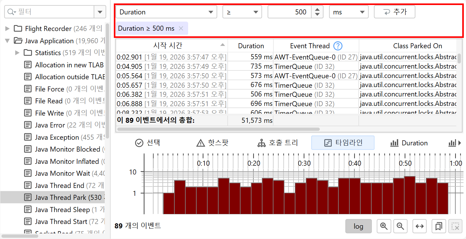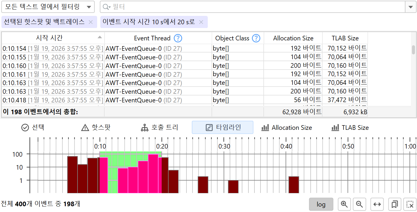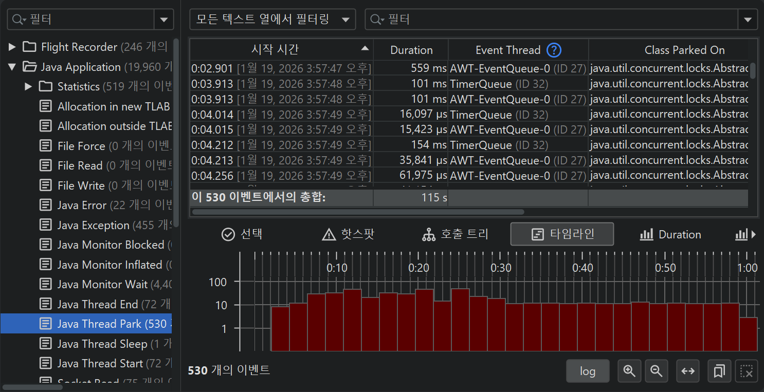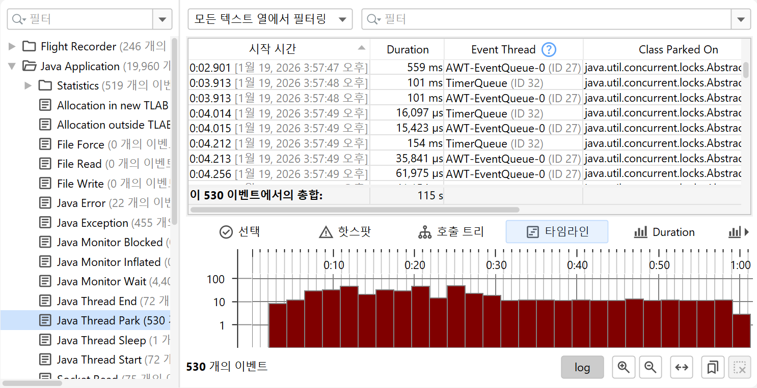 모든 JFR 이벤트는 관련된 시간을 가지고 있으므로, 모든 이벤트 유형 또는 이벤트 유형 집합은 이벤트의 시간 순서 분포를 보여주는 타임라인 뷰를 가지고 있습니다.