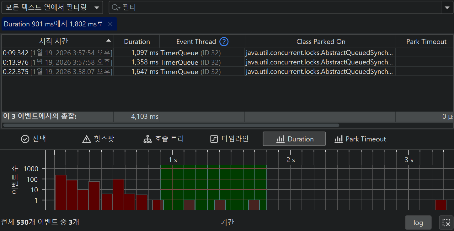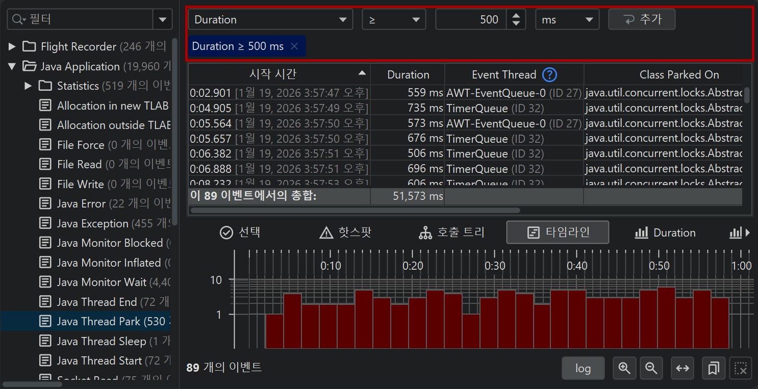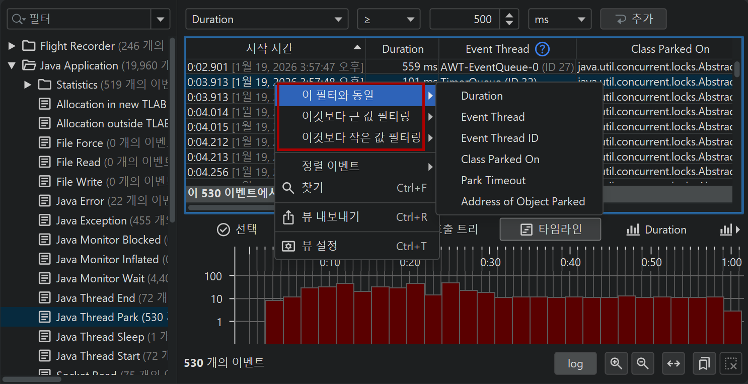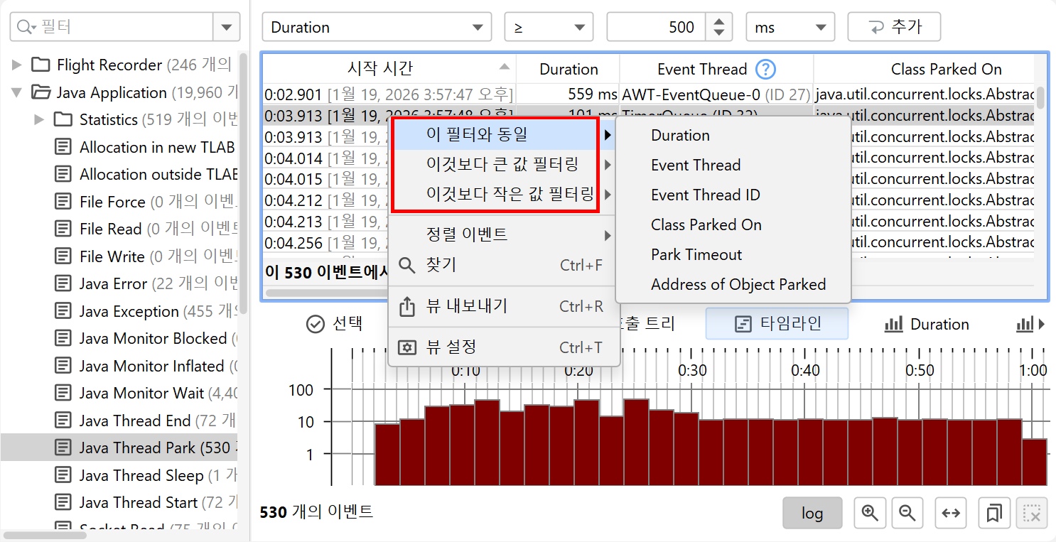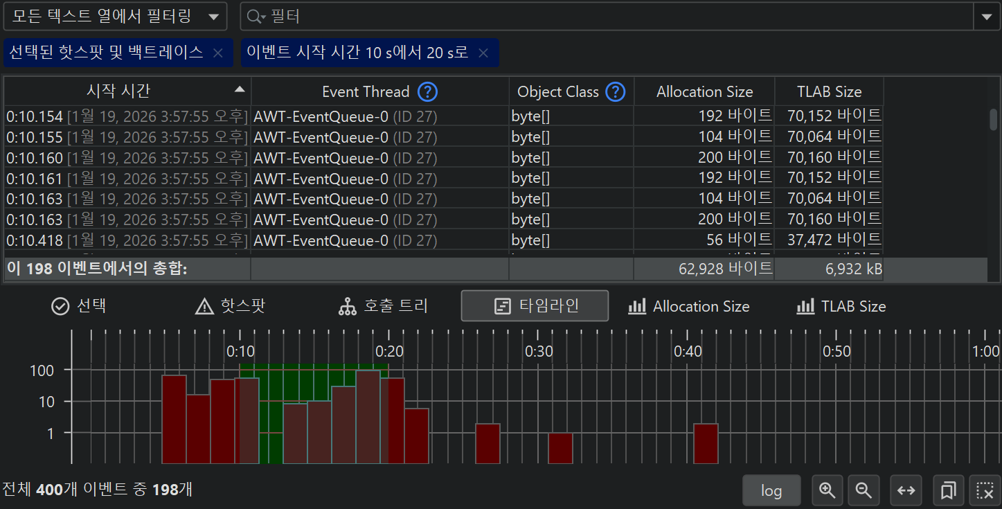 모든 JFR 이벤트는 관련된 시간을 가지고 있으므로, 모든 이벤트 유형 또는 이벤트 유형 집합은 이벤트의 시간 순서 분포를 보여주는 타임라인 뷰를 가지고 있습니다.
