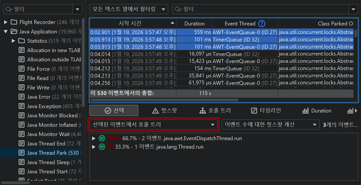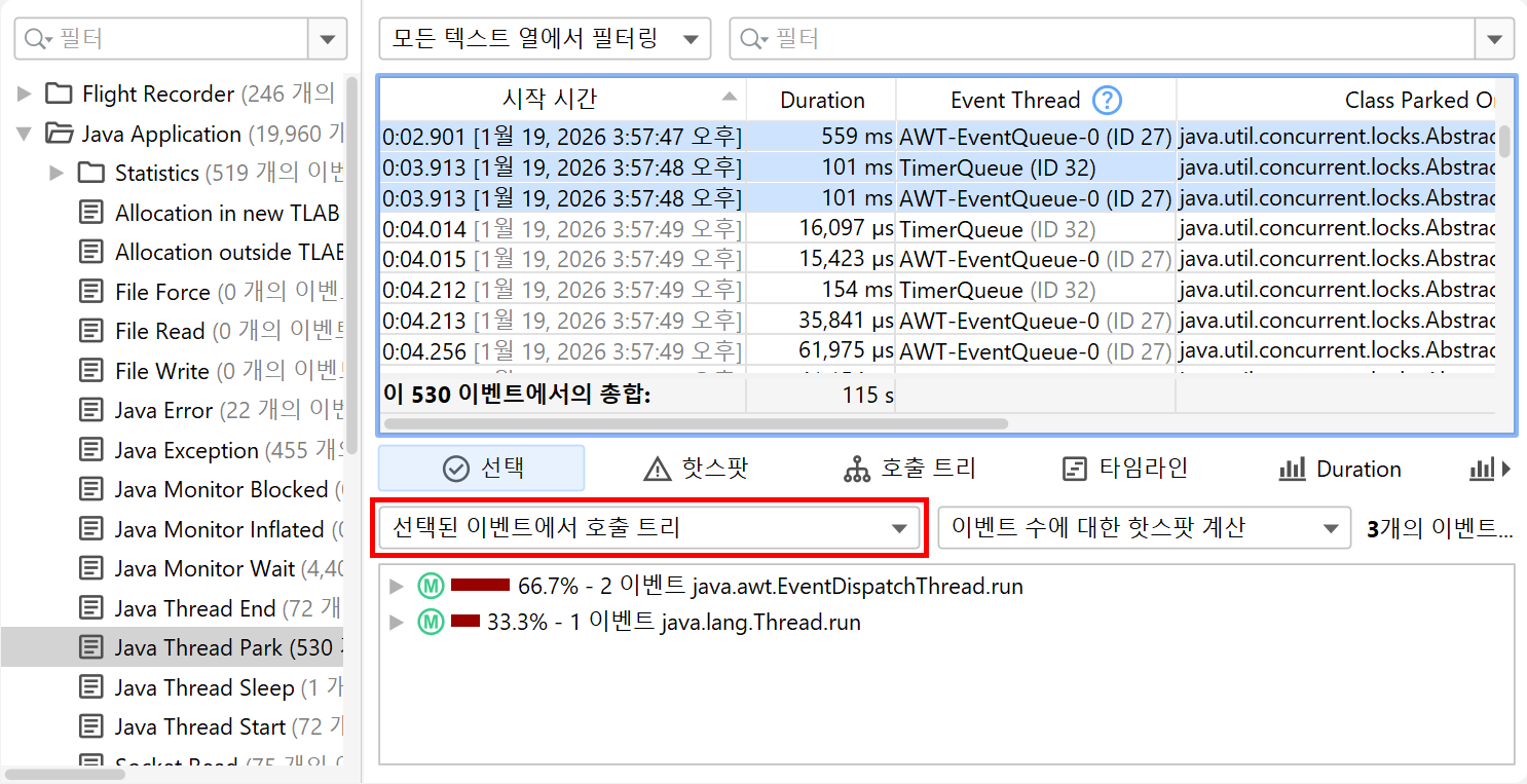 JProfiler에서는 선택된 이벤트의 스택 트레이스가 이벤트 테이블 아래의 분할 창의 "선택" 탭에 표시됩니다.