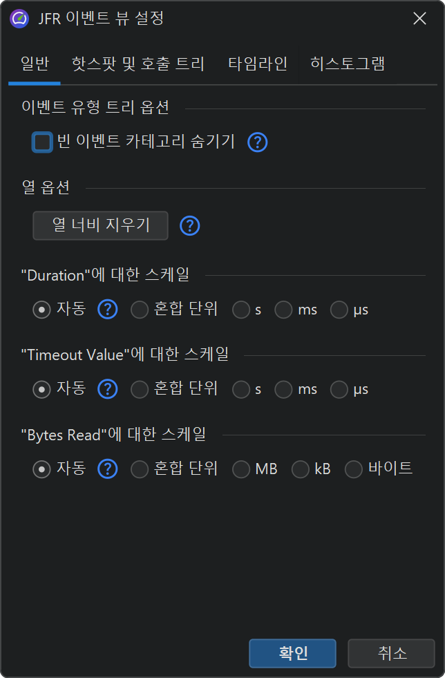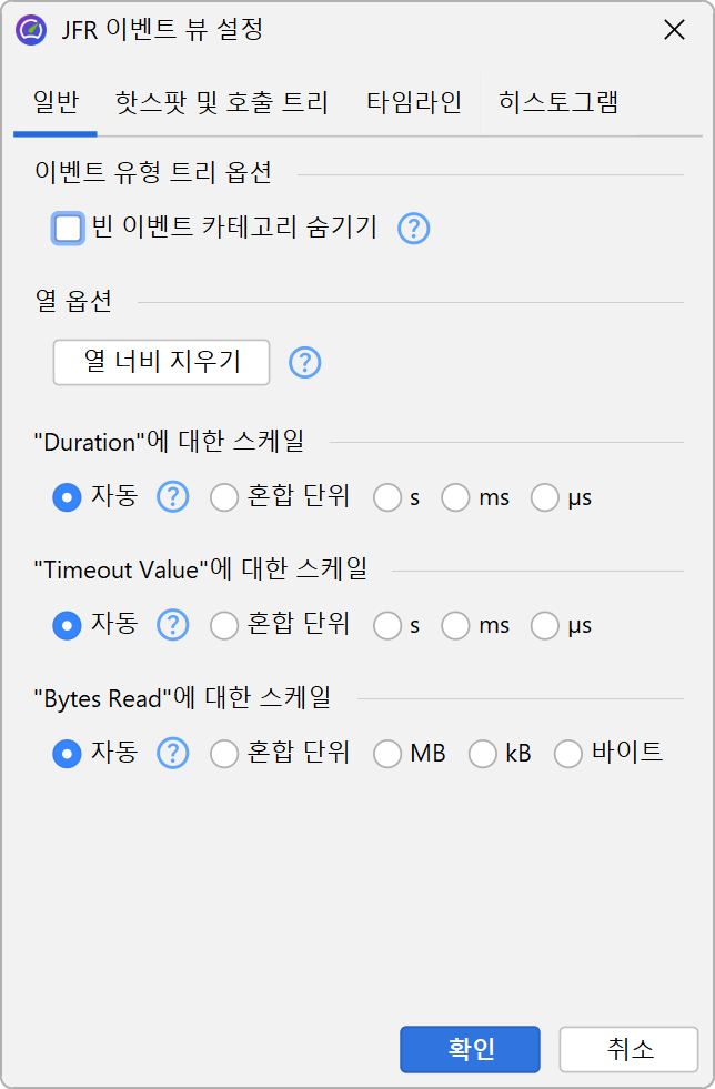 열 너비는 실제 콘텐츠에 따라 자동으로 조정되며, 열을 조정하면 동일한 콘텐츠 유형의 열 너비가 선택에 고정되어 더 이상 자동으로 변경되지 않습니다. 뷰 설정 대화상자에서 열 너비 지우기를 할 때까지는 변경되지 않습니다. 시간이나 메모리와 같은 단위가 있는 열의 스케일도 각 셀에 대해 자동으로 계산됩니다. 비교를 위해 열의 스케일을 고정하려면, 뷰 설정 대화상자에서 각 열에 대한 옵션을 제공합니다. 이 경우 설정은 선택된 각 이벤트 유형에 대해 별도로 저장됩니다.