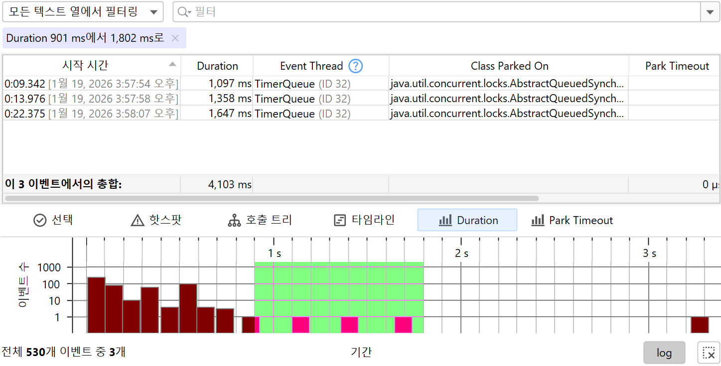 기본 표시 모드는 로그 모드로, 이벤트 수가 적은 영역도 이벤트 수가 많은 영역에 대해 여전히 보이도록 합니다. 타임라인 아래의 log 버튼을 선택 해제하여 선형 모드로 전환할 수 있습니다. 기본적으로 전체 시간 범위가 사용 가능한 너비에 표시되지만, 가변 시간 범위로 전환하고 다른 JProfiler의 텔레메트리와 마찬가지로 확대 및 스크롤할 수 있습니다. 또한 북마크를 사용할 수 있으며, 선택된 시간 범위에 수직 마커를 추가할 수 있습니다. 이렇게 하면 다른 이벤트 유형 간에 시간을 비교할 수 있습니다.