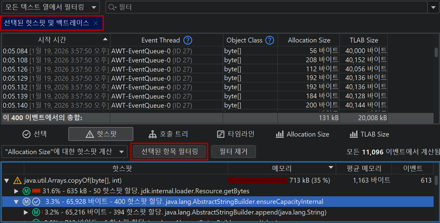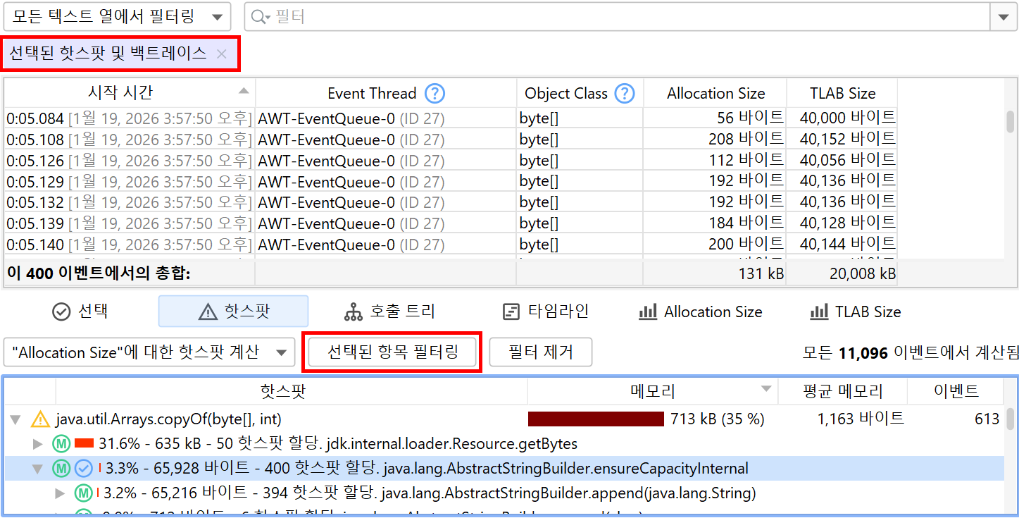 하단 분할 창의 "핫스팟" 및 "호출 트리" 뷰는 동일한 뷰를 포함하지만, 스냅샷의 모든 이벤트에 대해 계산됩니다. 선택 탭과 마찬가지로, "핫스팟 유형" 드롭다운도 있습니다. 모든 이벤트를 표시하는 것 외에도, 이러한 뷰에서 필터를 선택할 수 있습니다. 호출 트리 뷰에서는 특정 호출 스택을 선택하고 선택된 필터 버튼을 클릭하면 위의 테이블에 해당 호출 스택이 있는 이벤트만 표시됩니다. 핫스팟 뷰에서는 최상위 핫스팟이나 백트레이스의 노드를 선택하여 선택된 노드로의 역 호출 스택 조각으로 끝나는 이벤트만 표시할 수 있습니다.