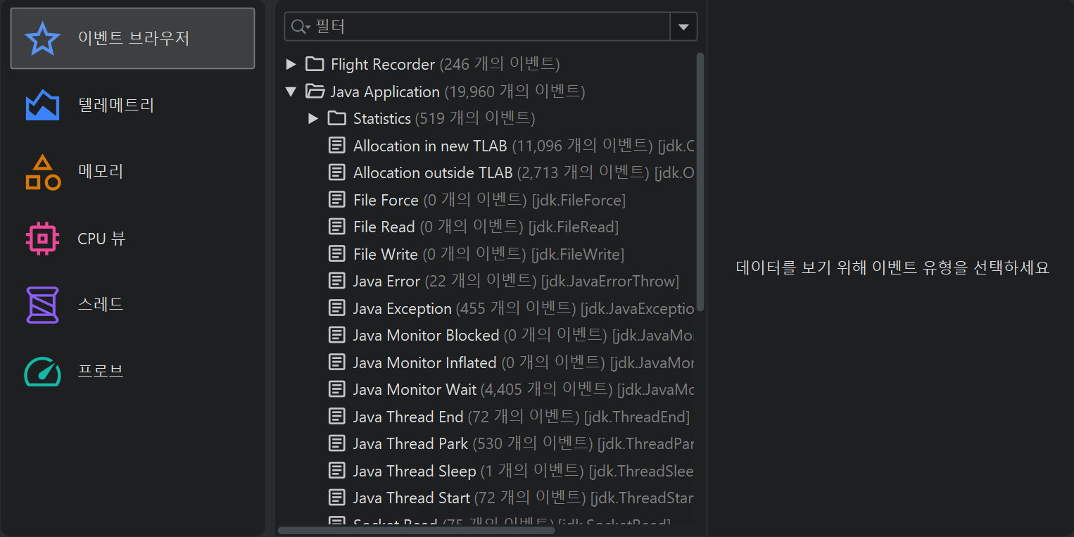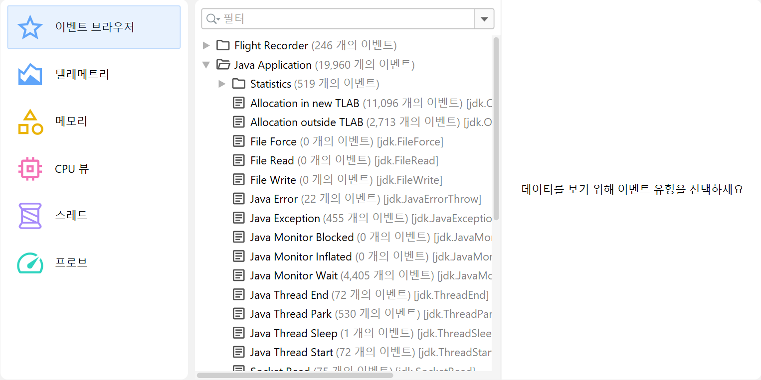 이벤트 브라우저는 JFR 스냅샷에 기록된 모든 데이터를 보여줍니다.
