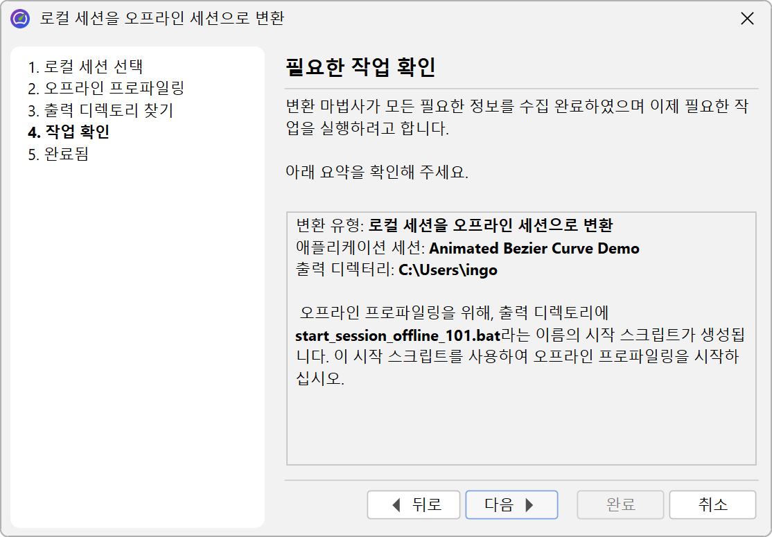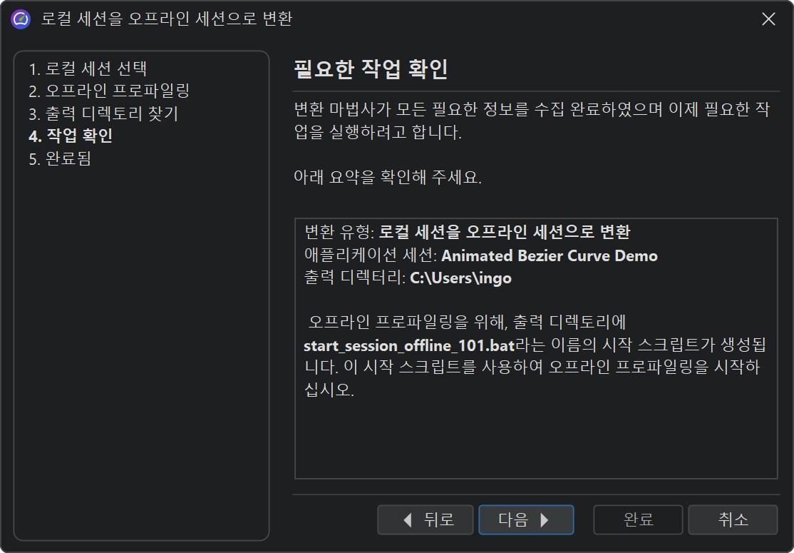 JProfiler에서 시작된 세션을 구성한 경우, 메인 메뉴에서 세션→변환 마법사→애플리케이션 세션을 오프라인으로 변환을 호출하여 오프라인 세션으로 변환할 수 있습니다. 이렇게 하면 적절한 VM 매개변수를 사용하여 시작 스크립트를 생성하고, JProfiler UI에서 사용하는 동일한 세션의 프로파일링 설정을 가져옵니다. 호출을 다른 컴퓨터로 이동하려면 세션→세션 설정 내보내기를 사용하여 세션을 구성 파일로 내보내고, 시작 스크립트의 VM 매개변수가 해당 파일을 참조하도록 해야 합니다.